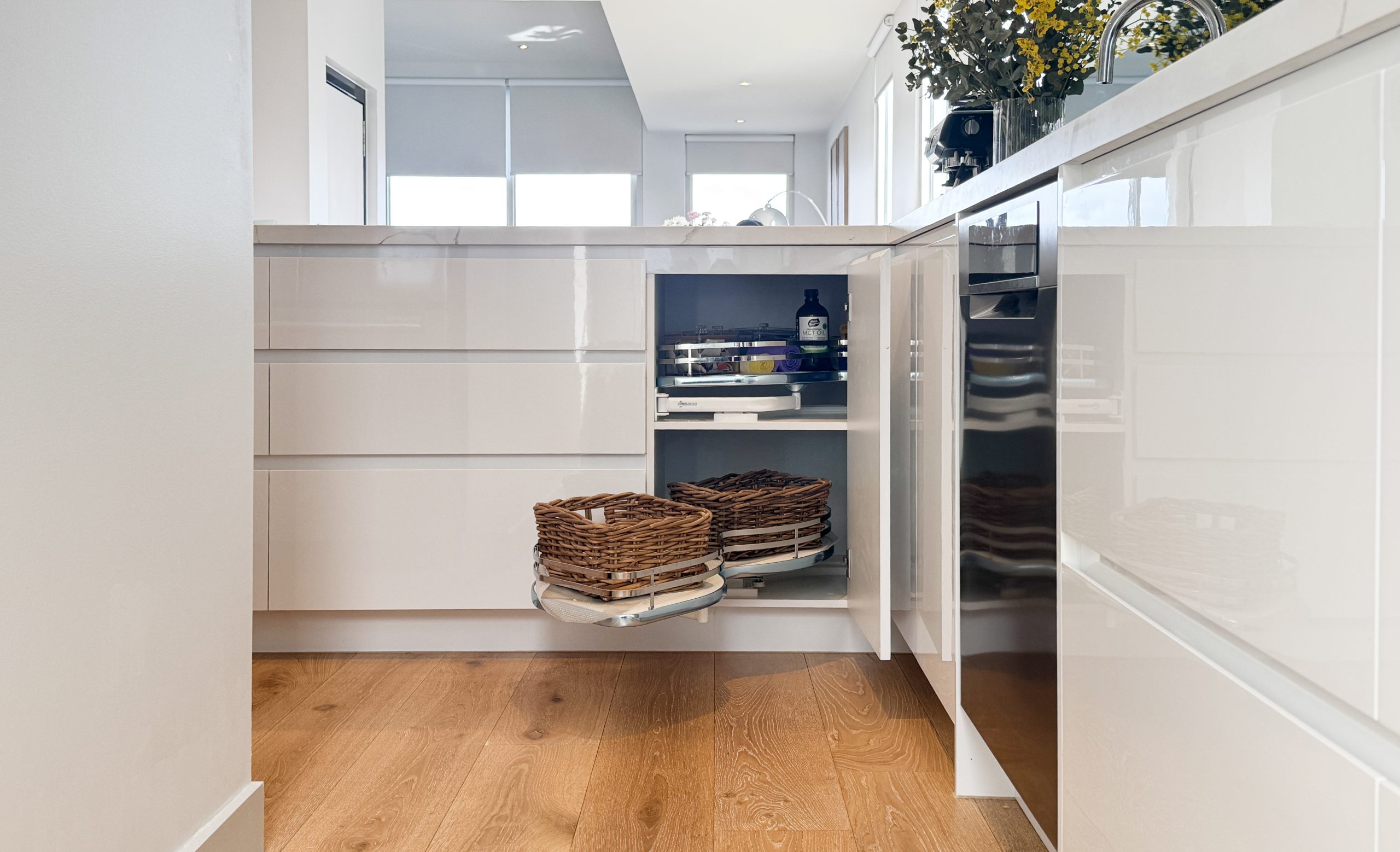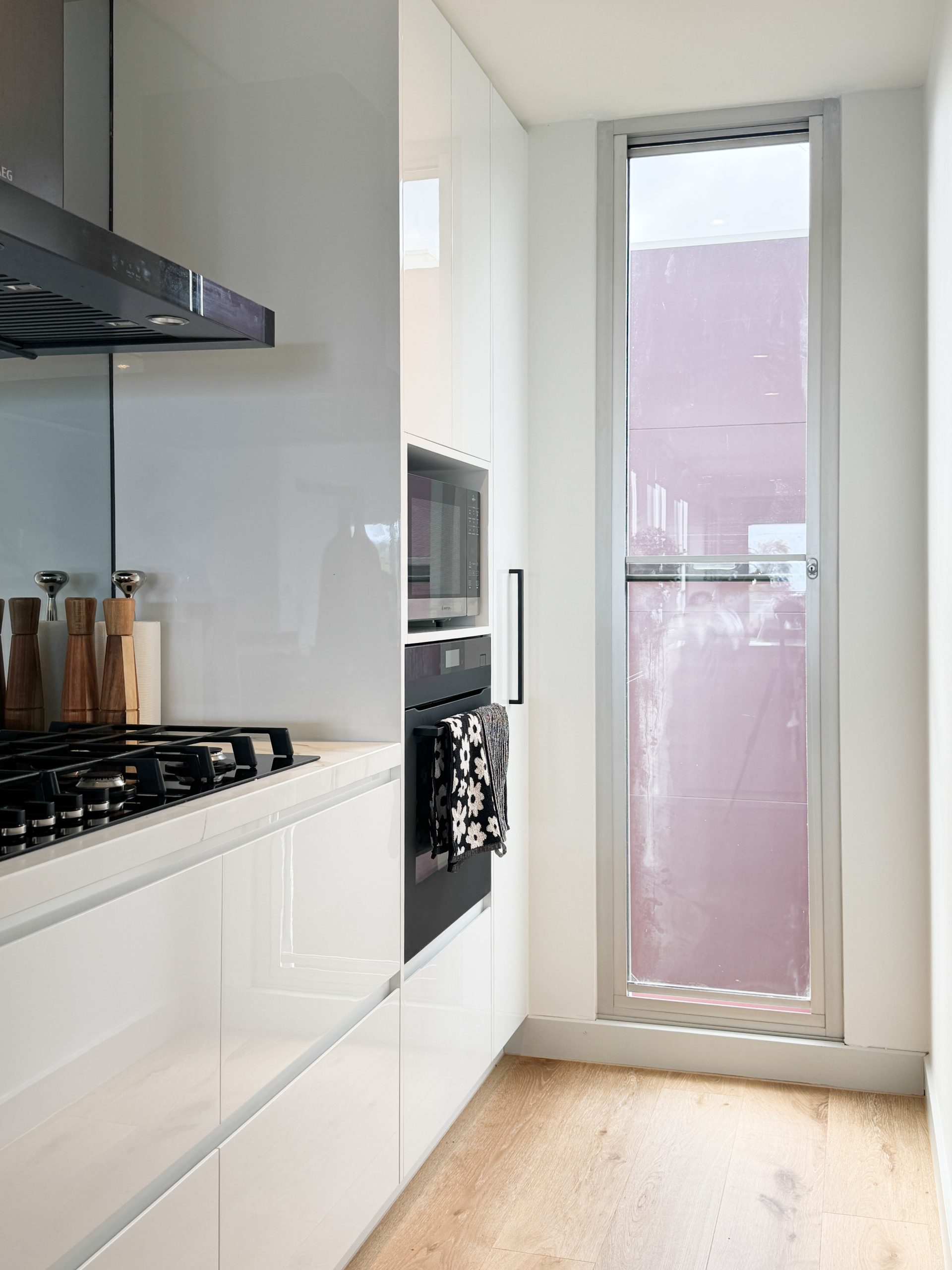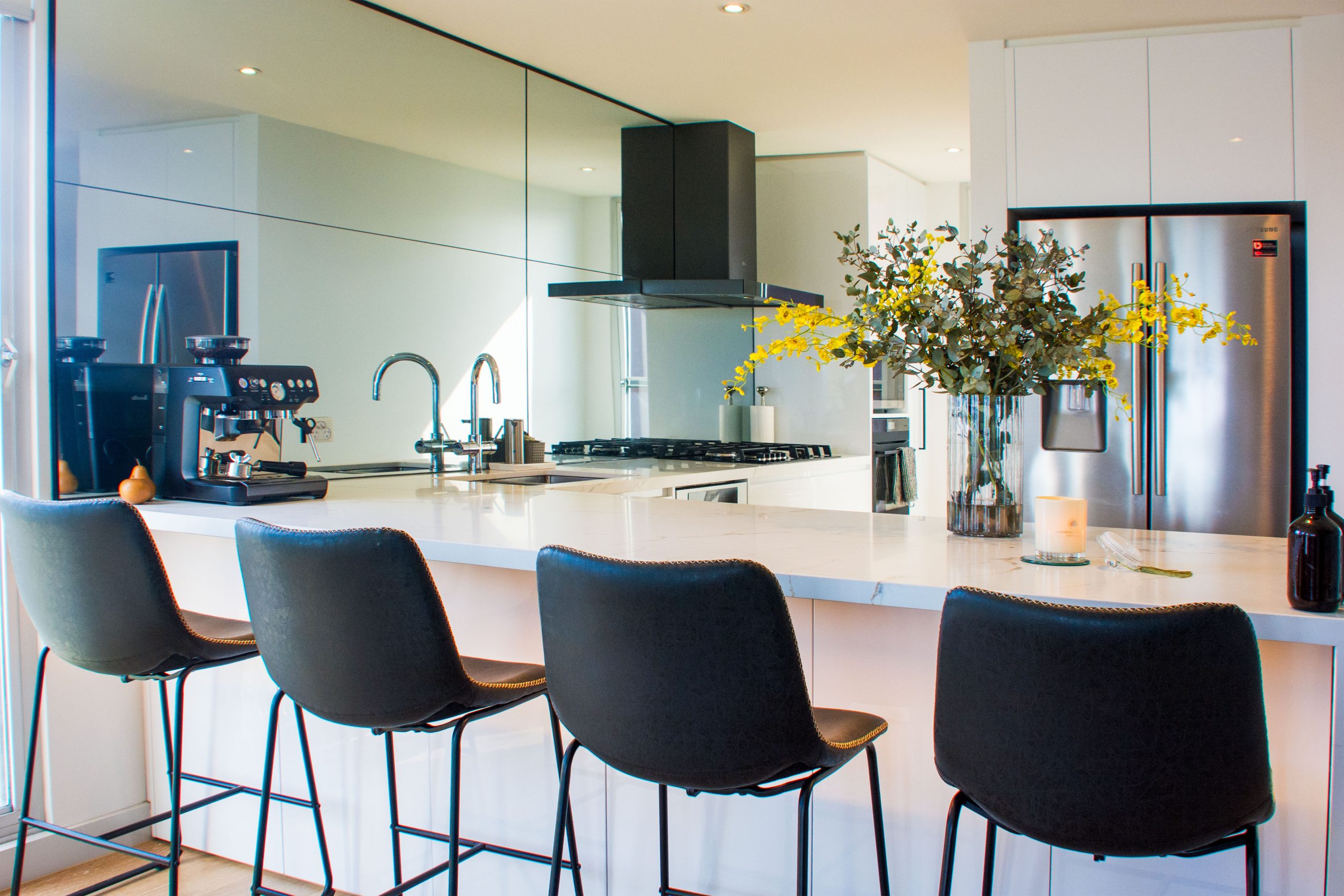 Visually, the kitchen strikes the right balance between minimalism and refinement. High-gloss 2PAC cabinetry reflects the natural light, while a stone benchtop with Calacatta-inspired veining adds subtle elegance. The mirrored splashback amplifies light and creates the illusion of a larger space—an intentional design choice that pairs perfectly with the uncluttered layout.
