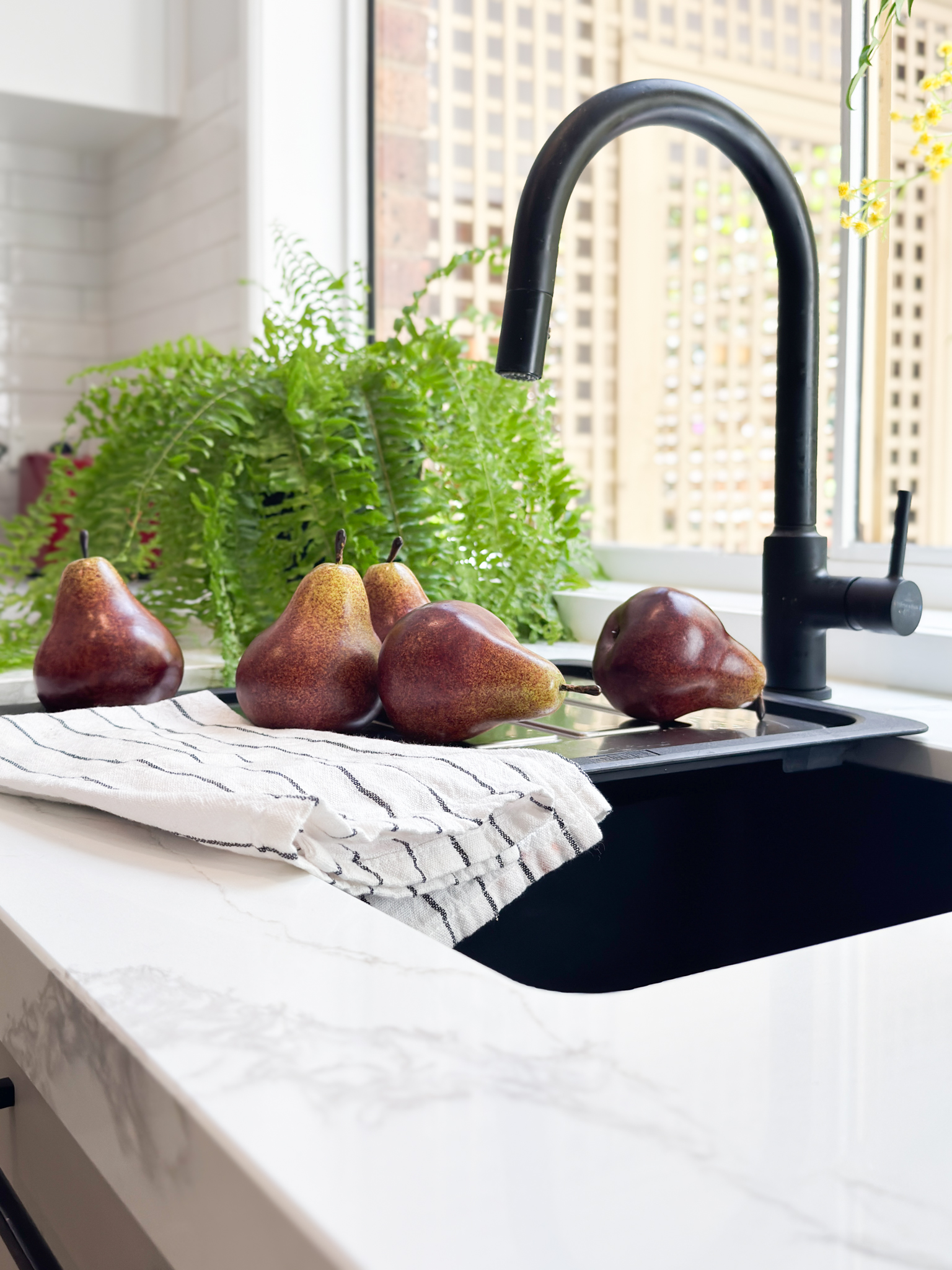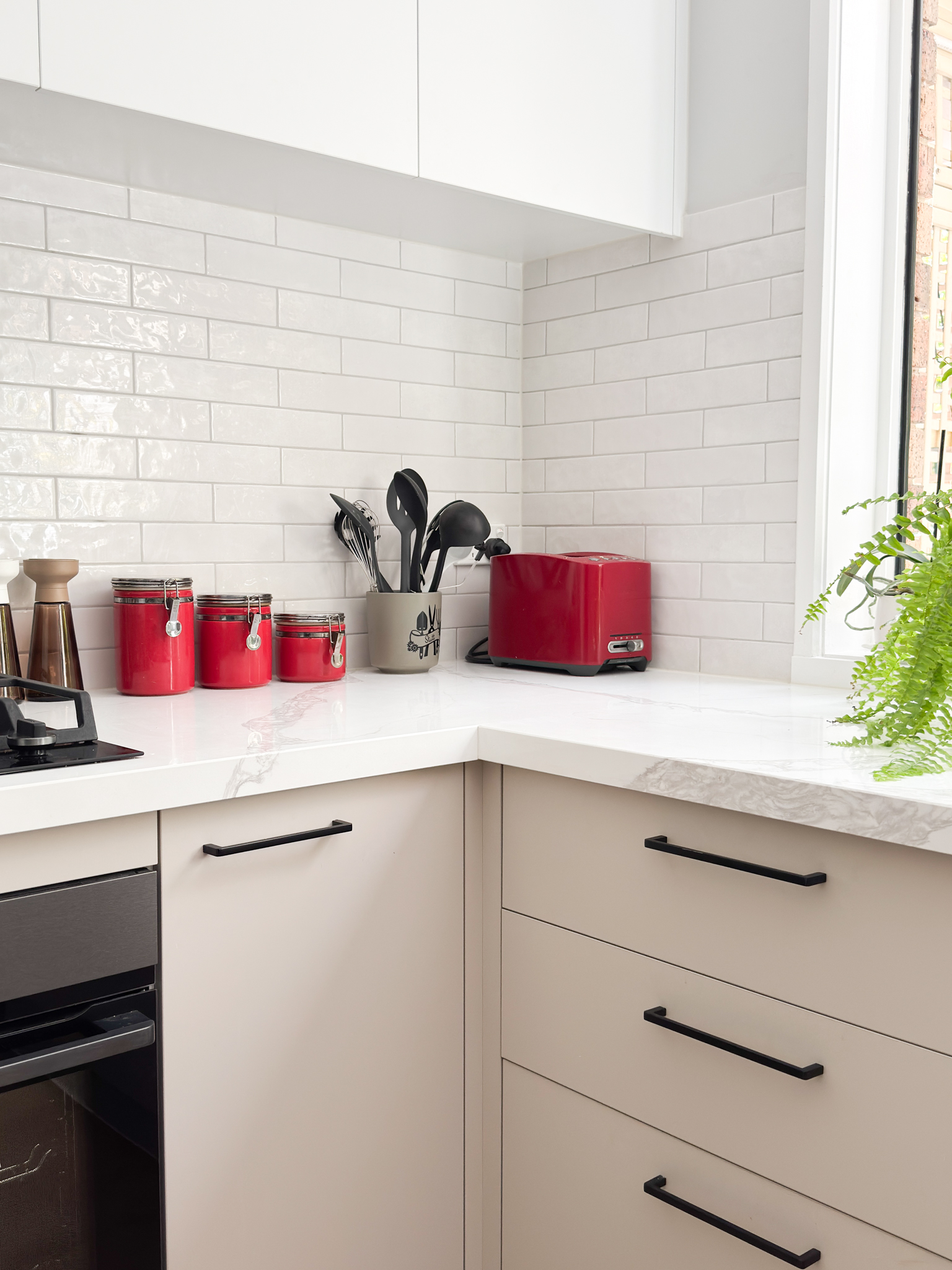 | Description: | Two-toned minimalist kitchen, accented by pops of colour, greenery and warm woodtones. Original built-in pantry was kept and inserted L-shape shelves for more functional storage. Stunning waterfall edge that highlights the beautiful veins of the Calacatta stone. |