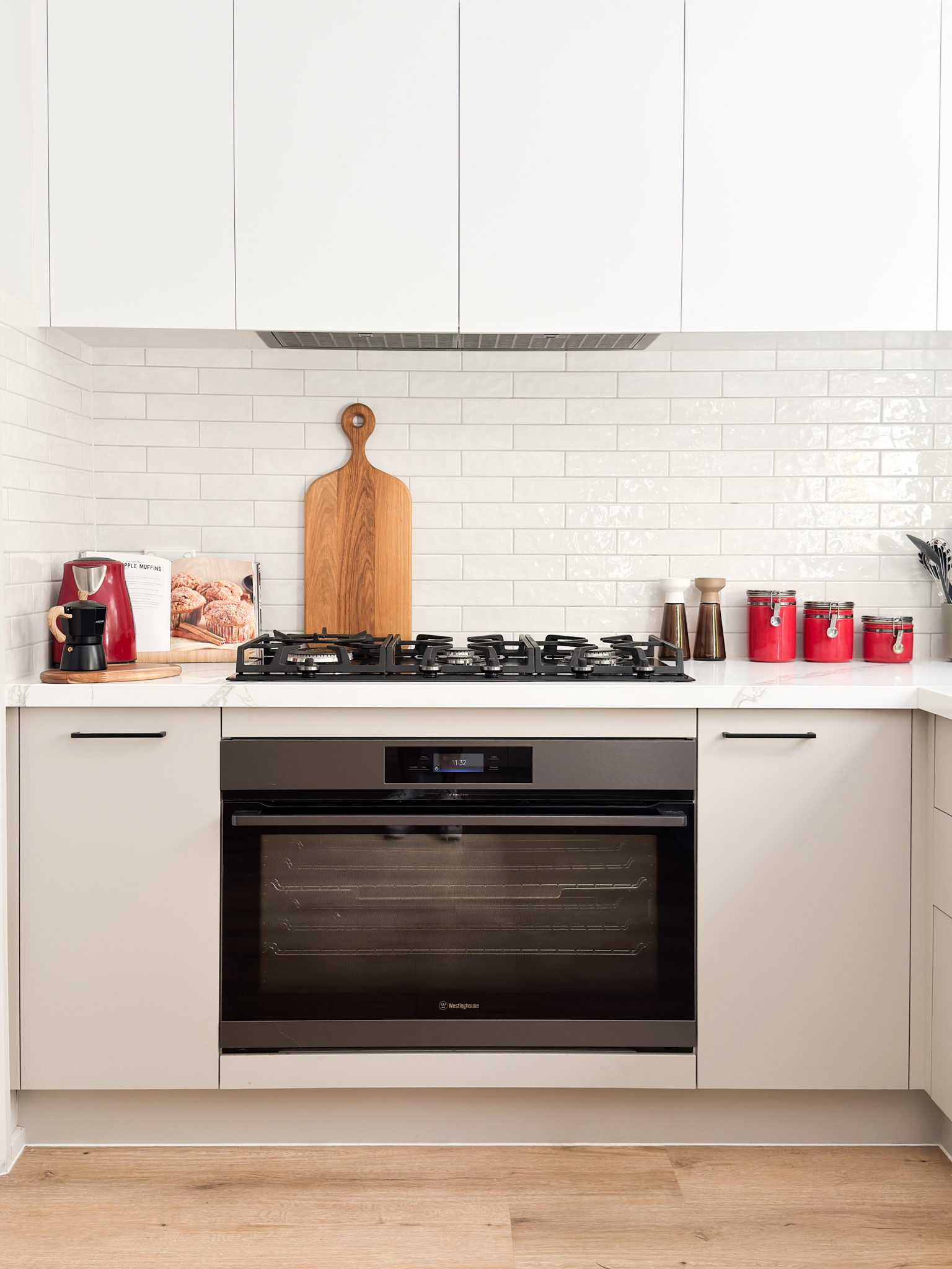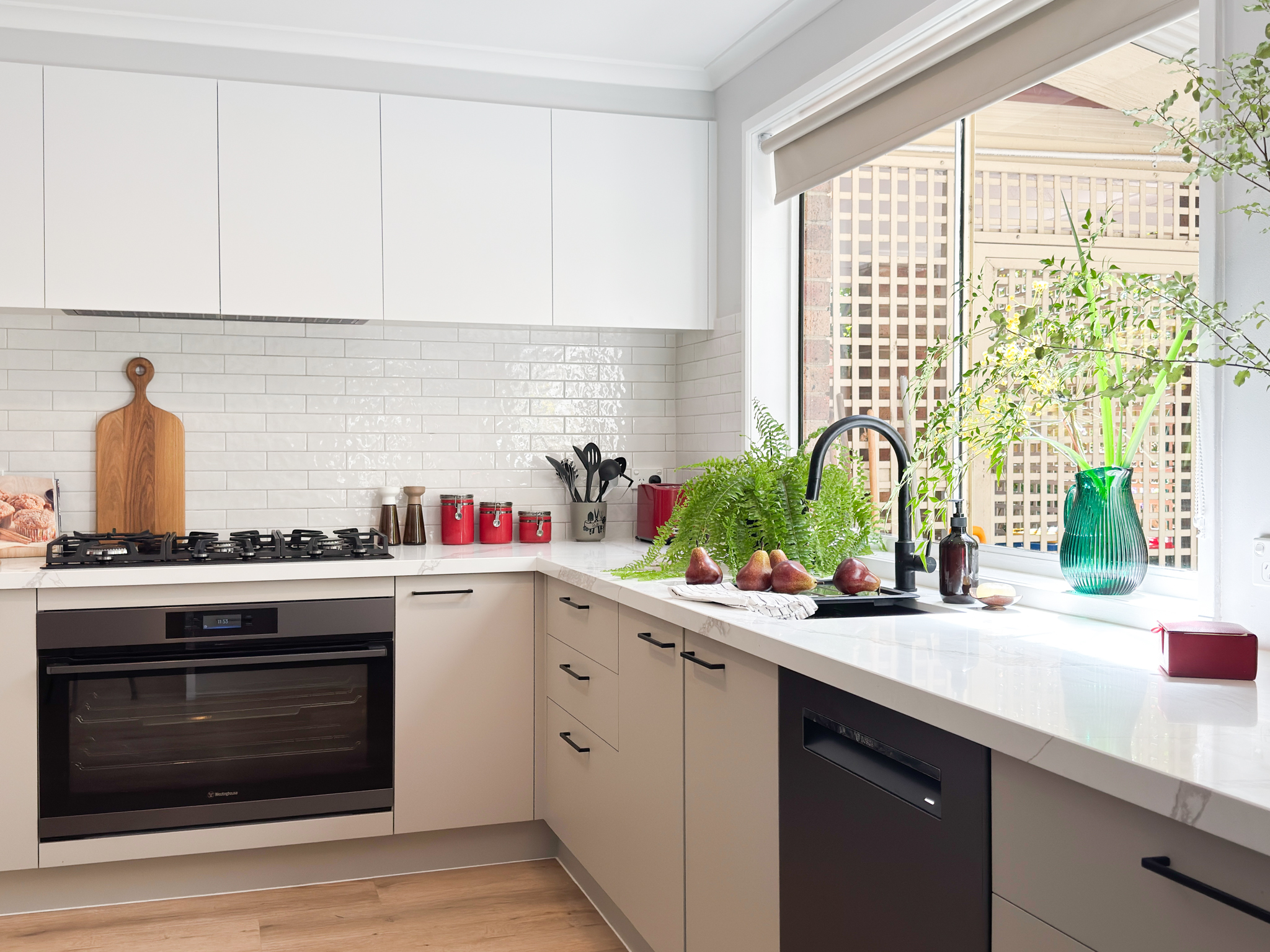 | Doors and panel: | Laminex Calm White Natural finish (Wall). Laminex Pearl Grey Natural finish (Floor & Tall). |