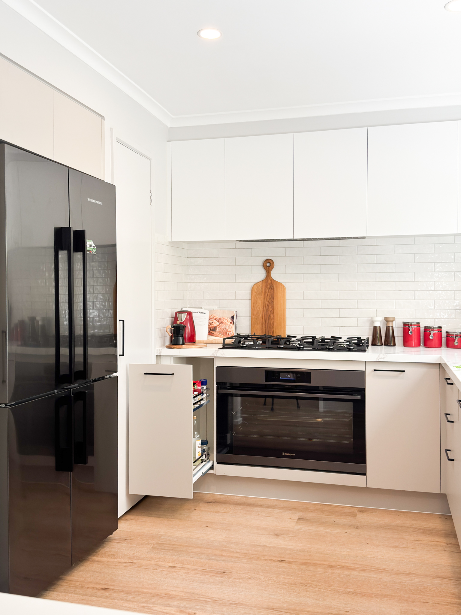| Hardware: | Hettich Actro 5D softclose undermount runner Blum clip top soft-close hinges SIGE spice rack pullout 300mm Stefano Orlatti Square Handles 4062 in Matt Black |