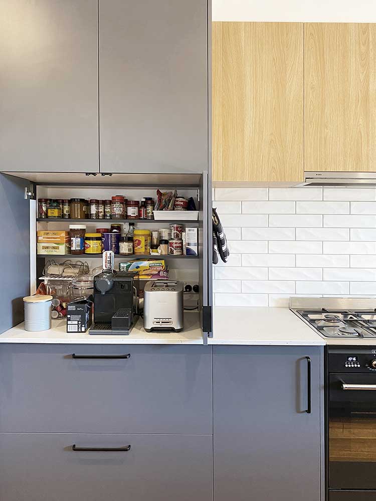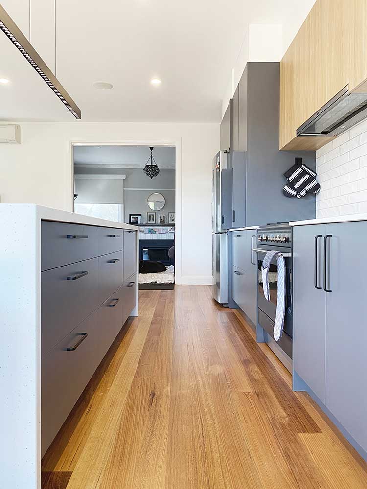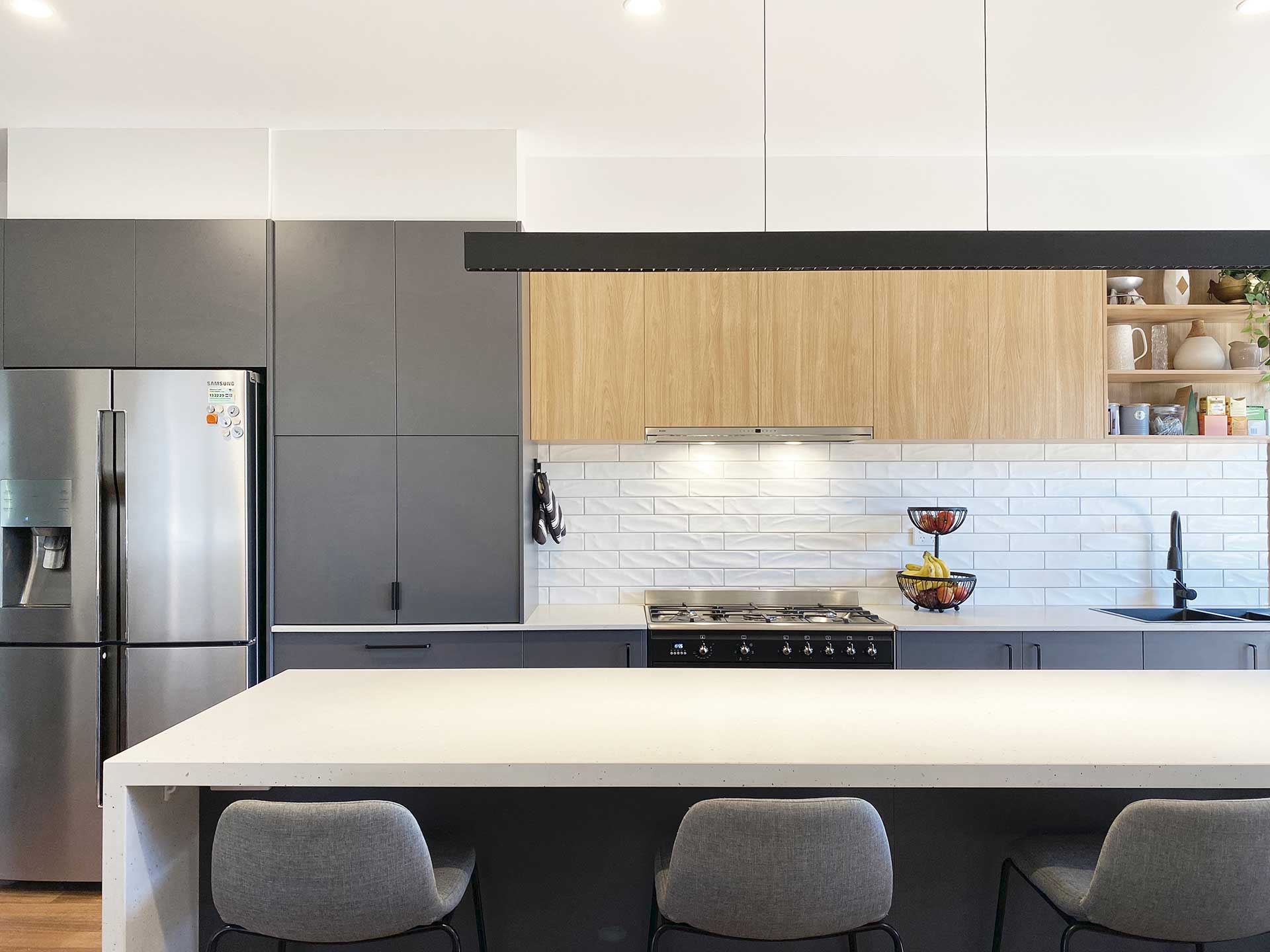 | Description: | Contemporary two-toned Galley kitchen with grey, white and wood grain, tile splashback, appliance garage, breakfast bar, kicker storage, and canopy rangehood with chrome finishes. |