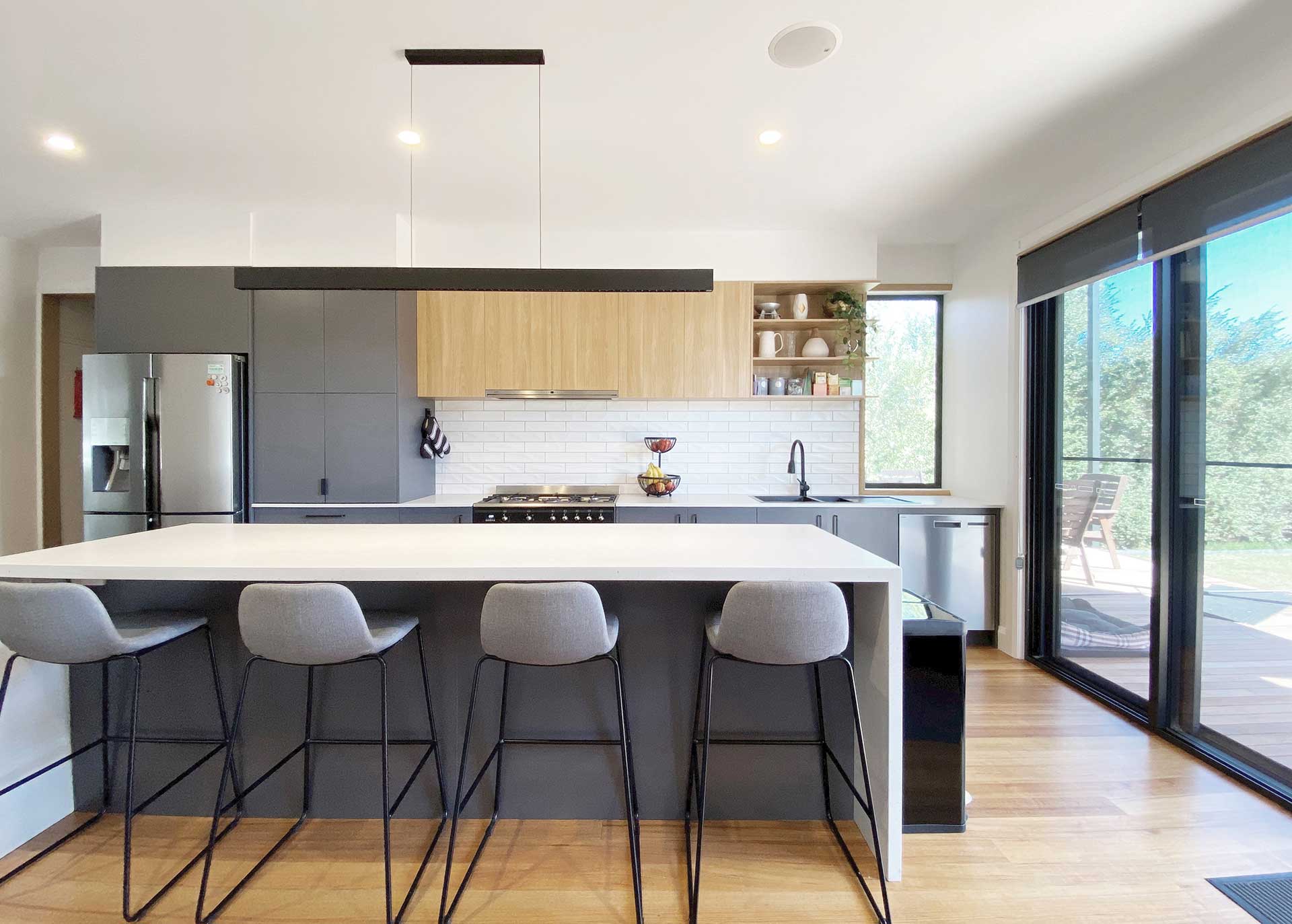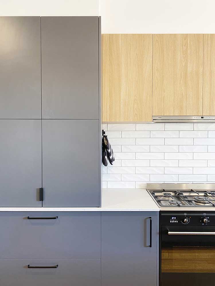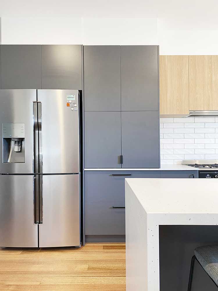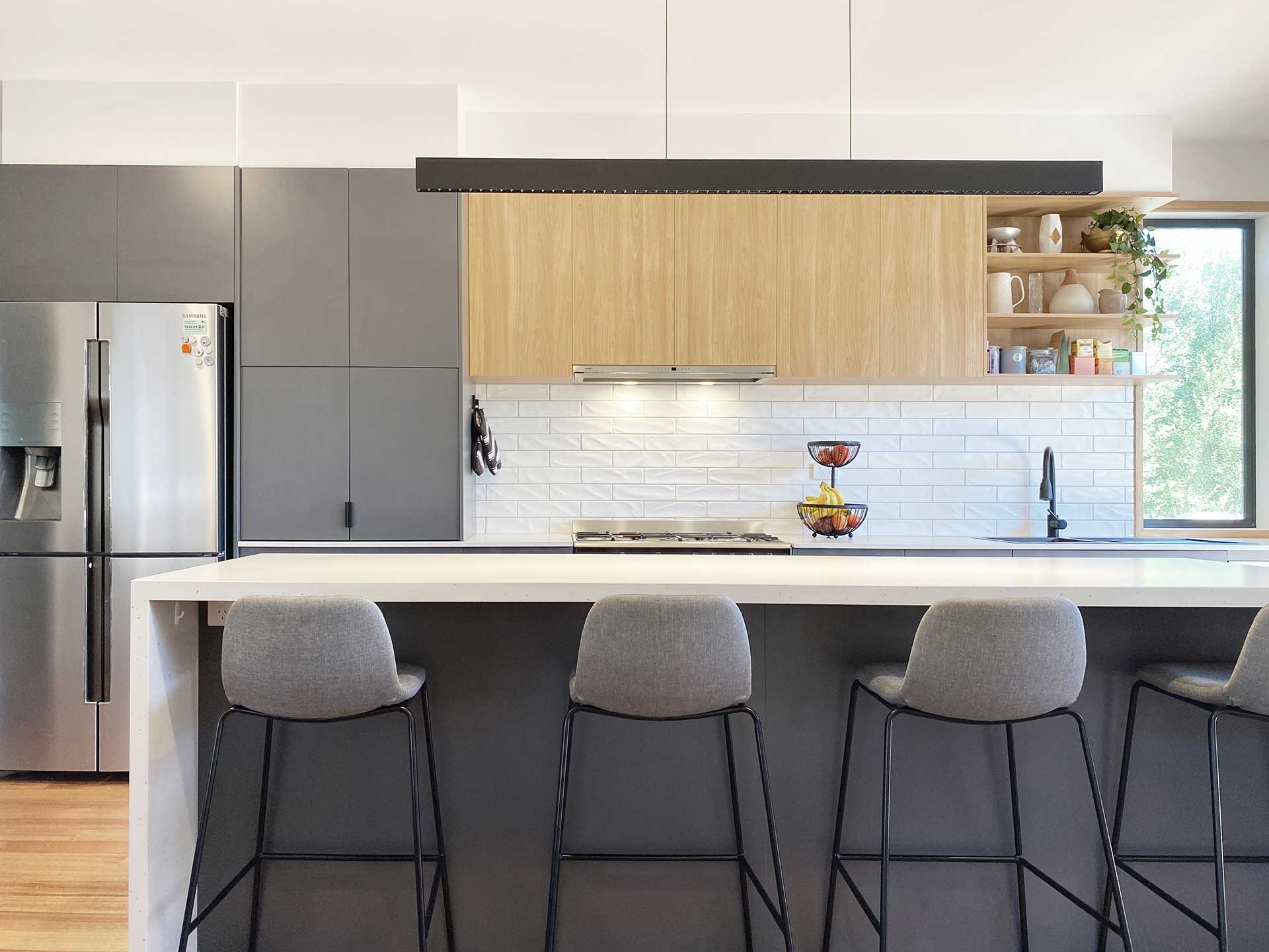 | Description: | Contemporary two-toned Galley kitchen with grey, white and wood grain, tile splashback, appliance garage, breakfast bar, kicker storage, and canopy rangehood with chrome finishes. |