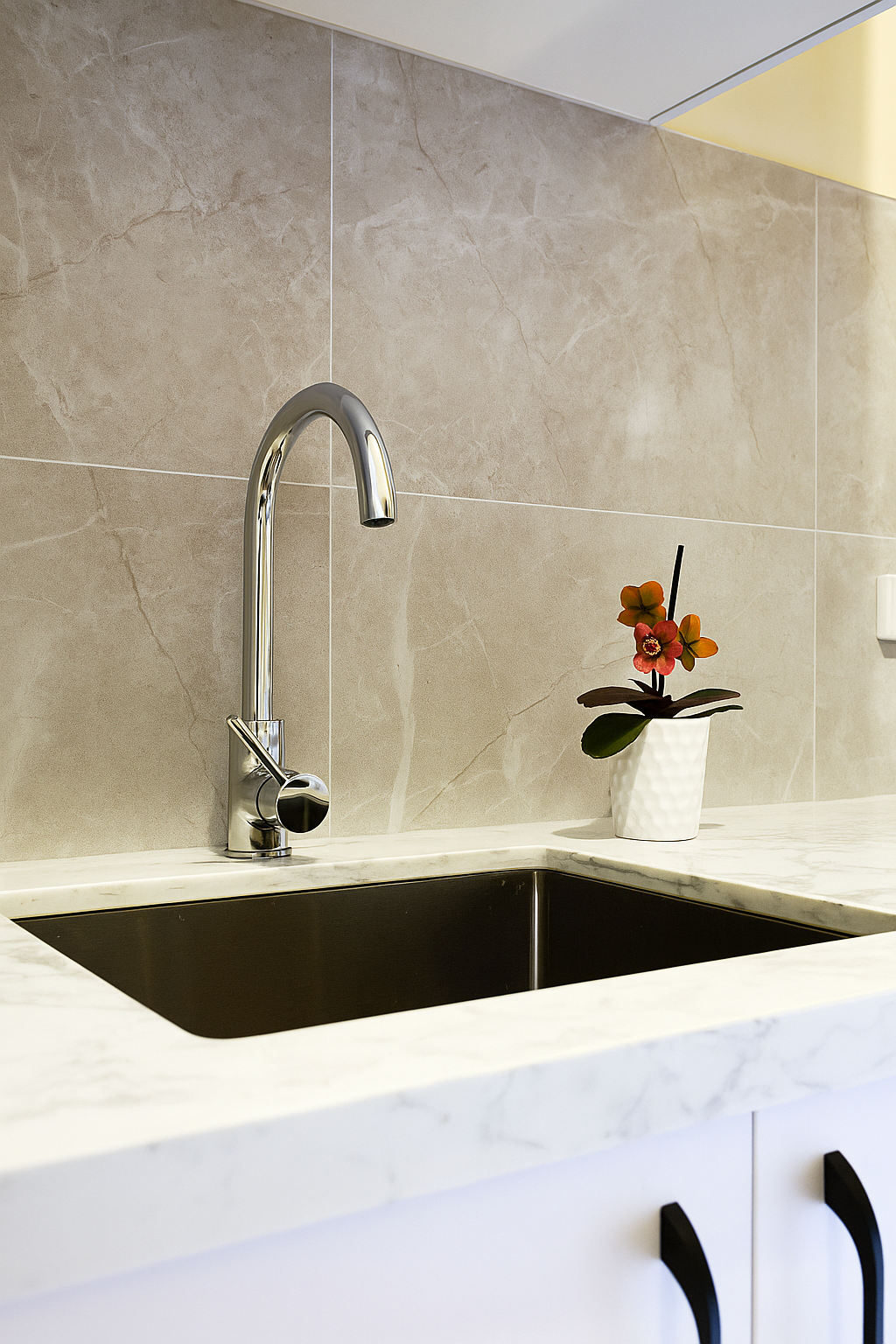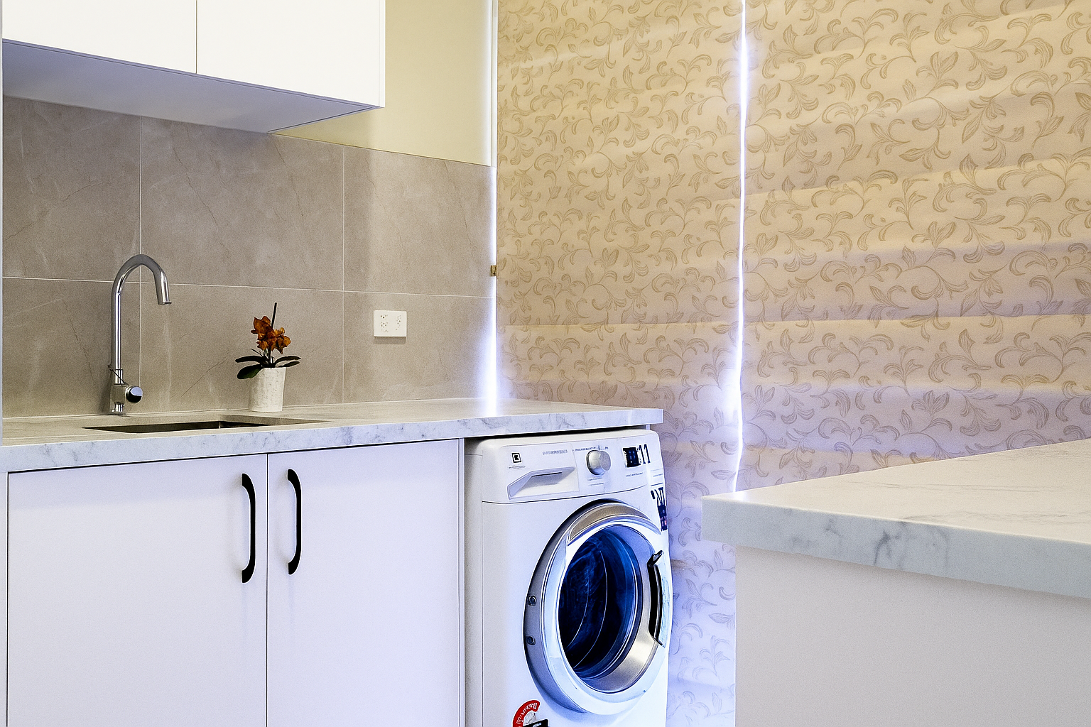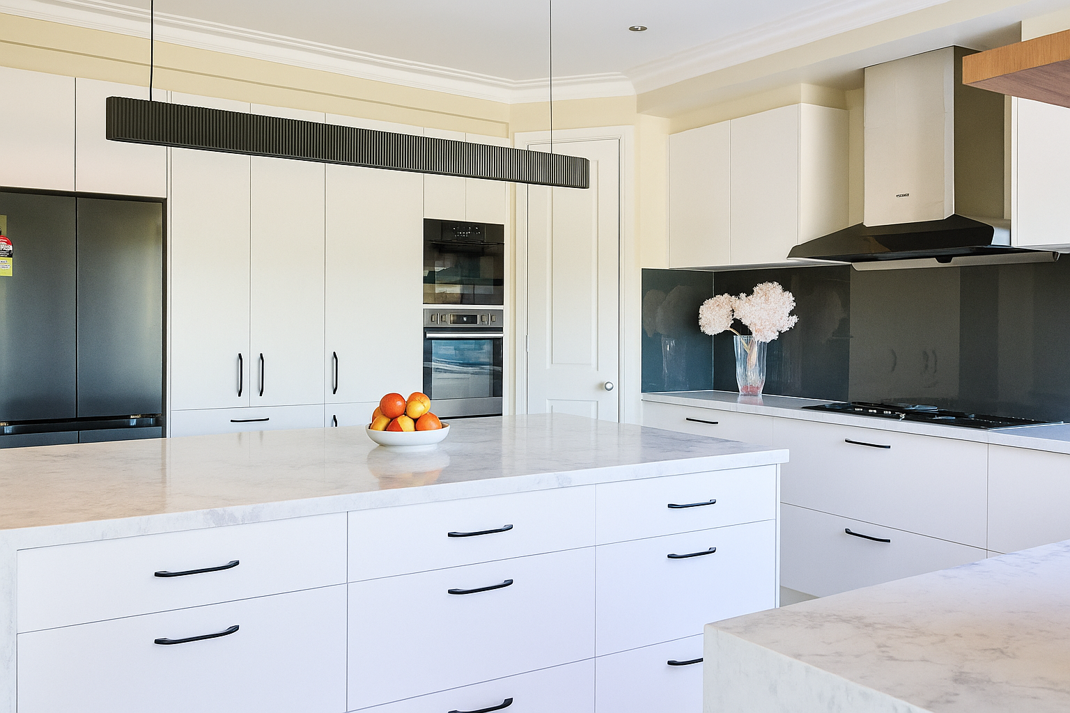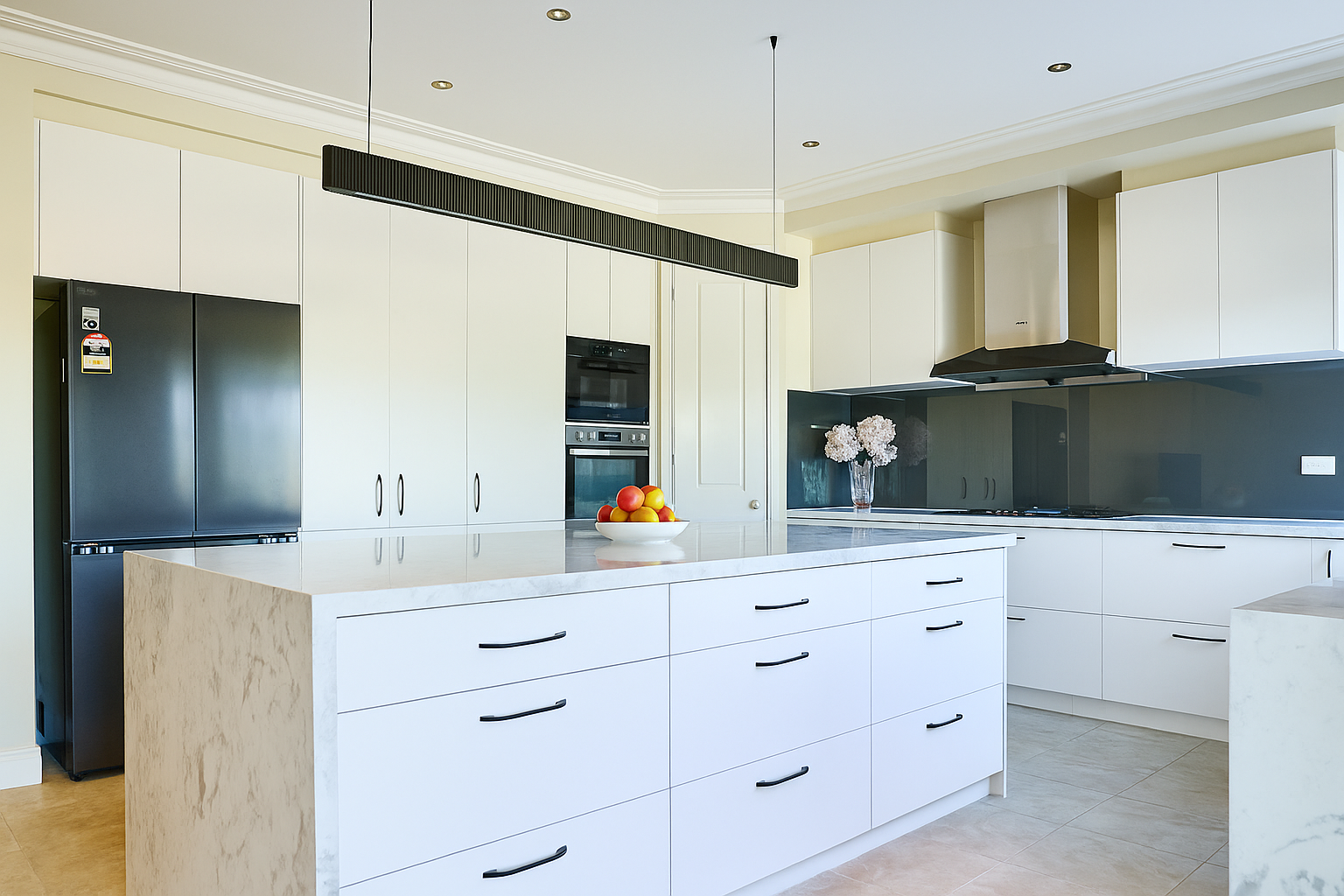 | Description: | Features a striking marble island, clean white cabinetry in a U-shape layout with black handle, and appliance accents, and dark blue toughened glass splashback. |