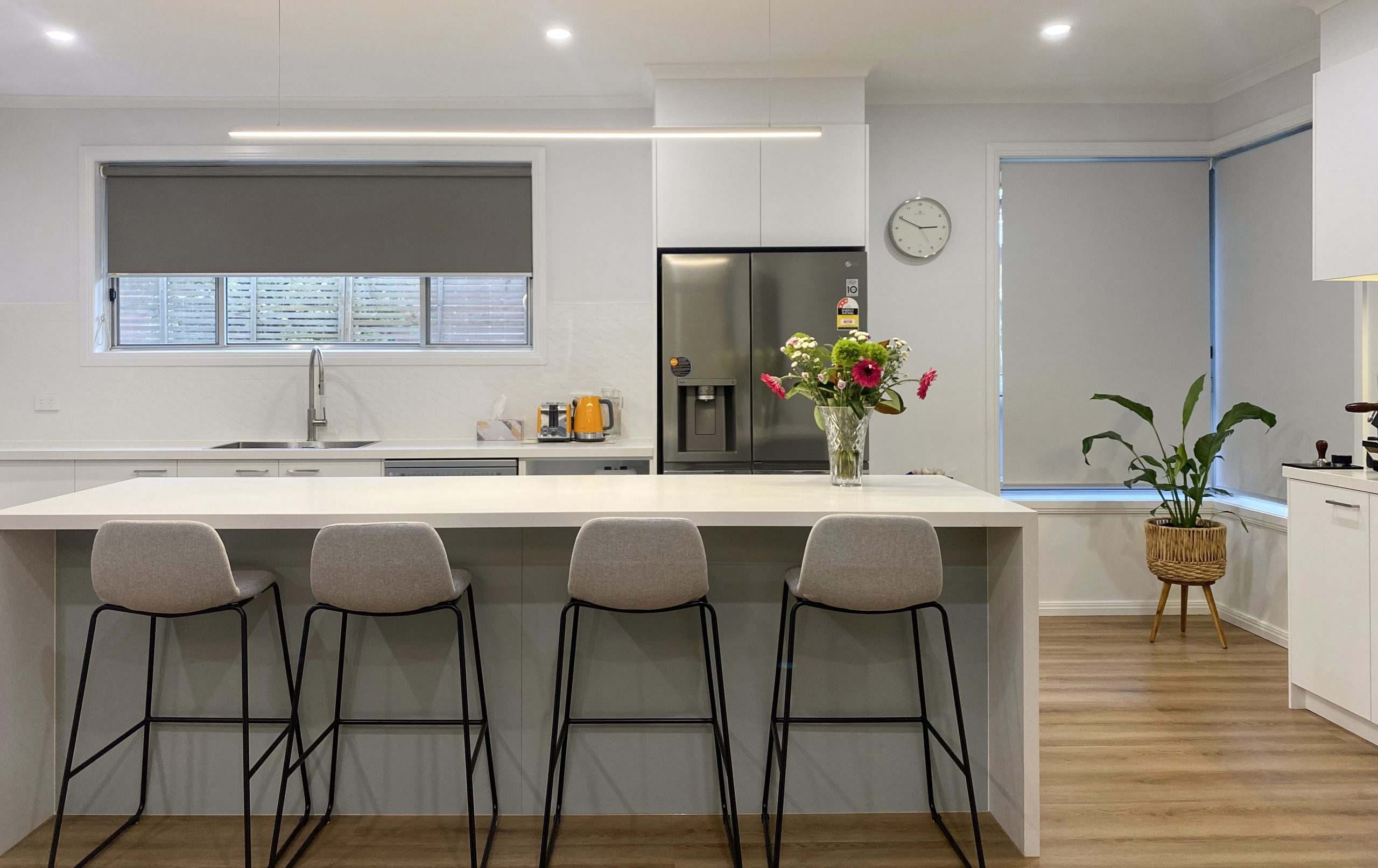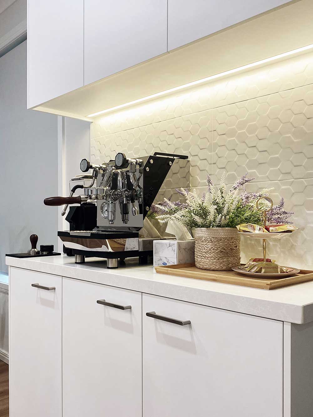 | Description: | Contemporary Green and White L-shaped kitchen island with concealed rangehood, coffee counter, breakfast bar, and hexagonal splashback with chrome accessories. |