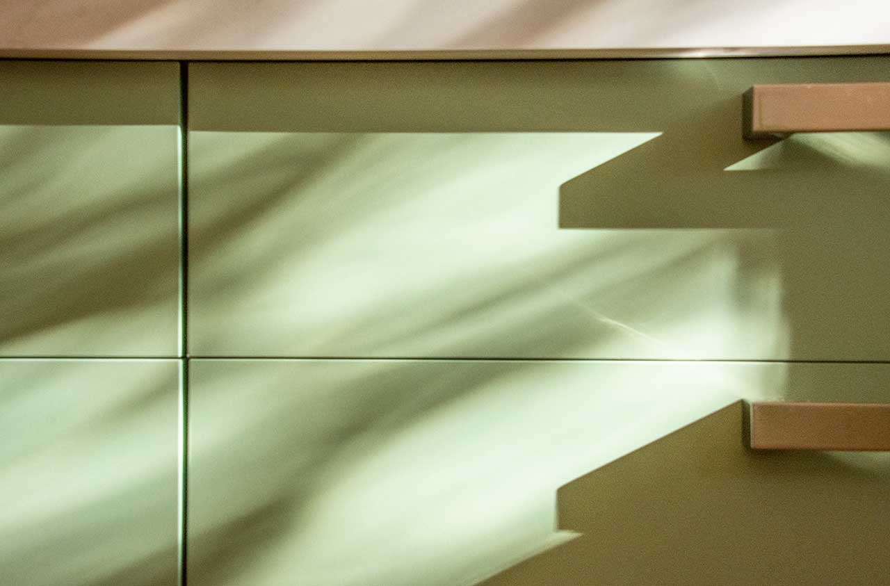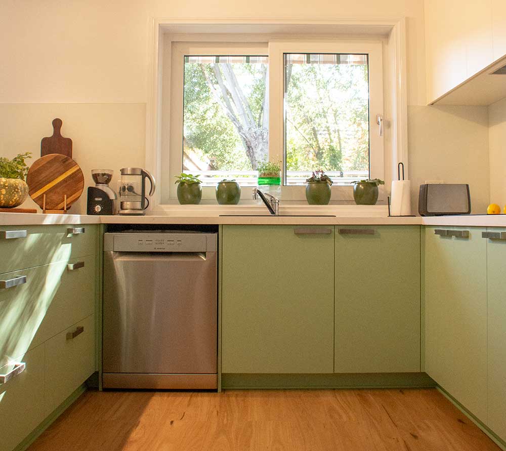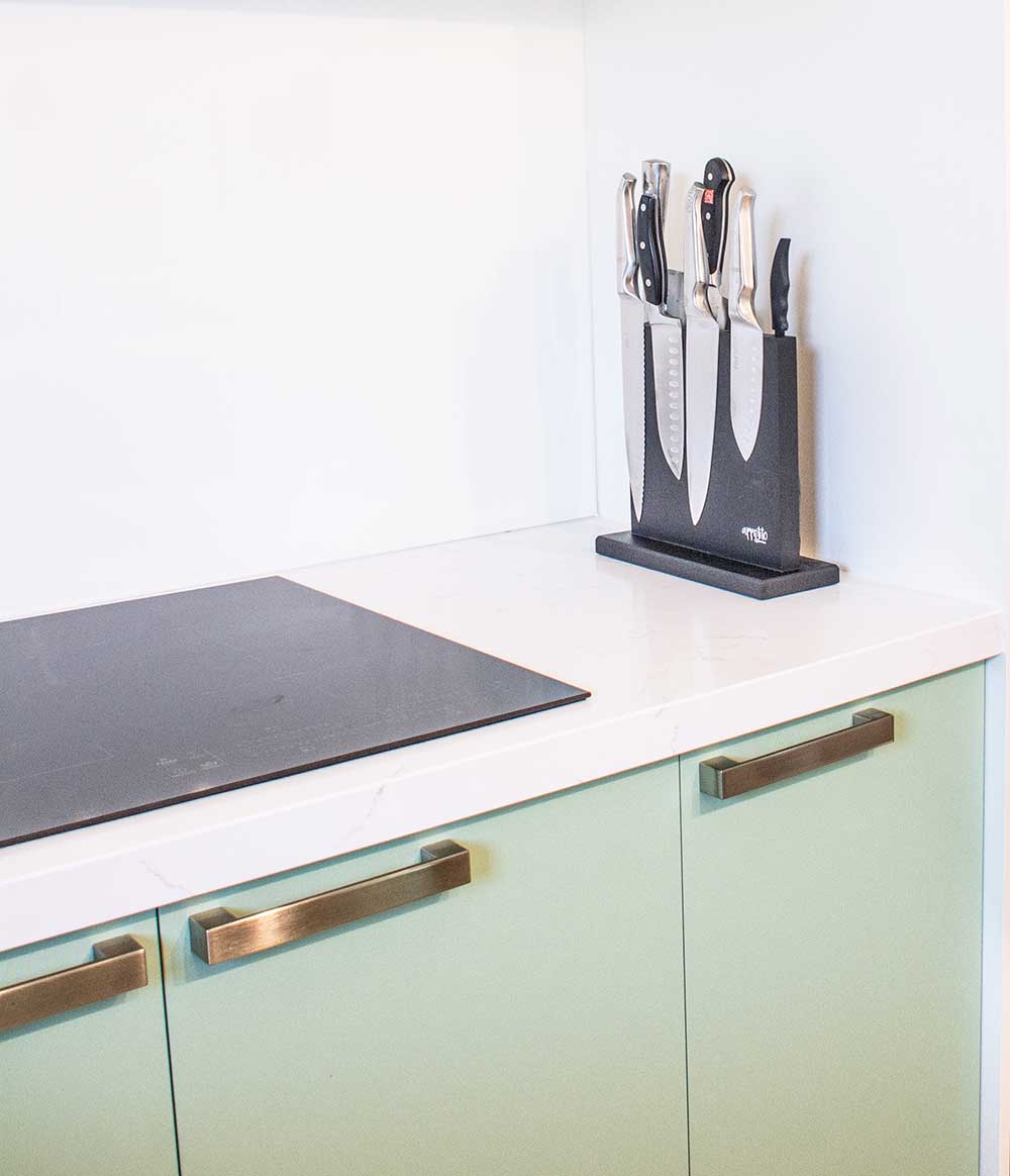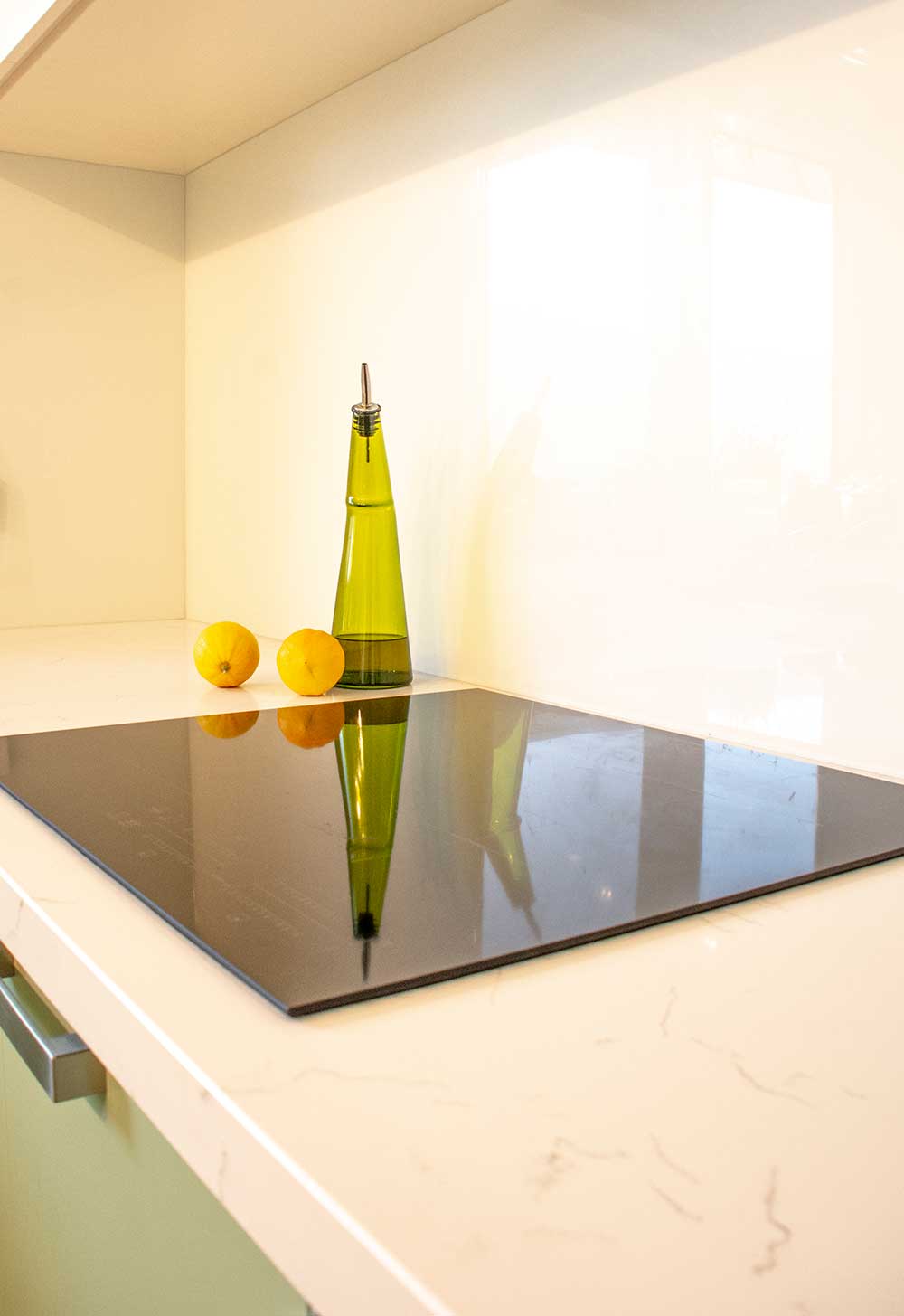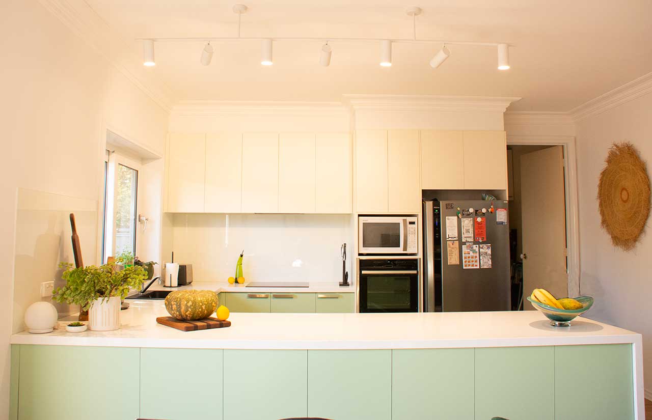 | Description: | Light Green and White Modern U-shape kitchen, marble vein benchtop, concealed rangehood with chrome accessories. |