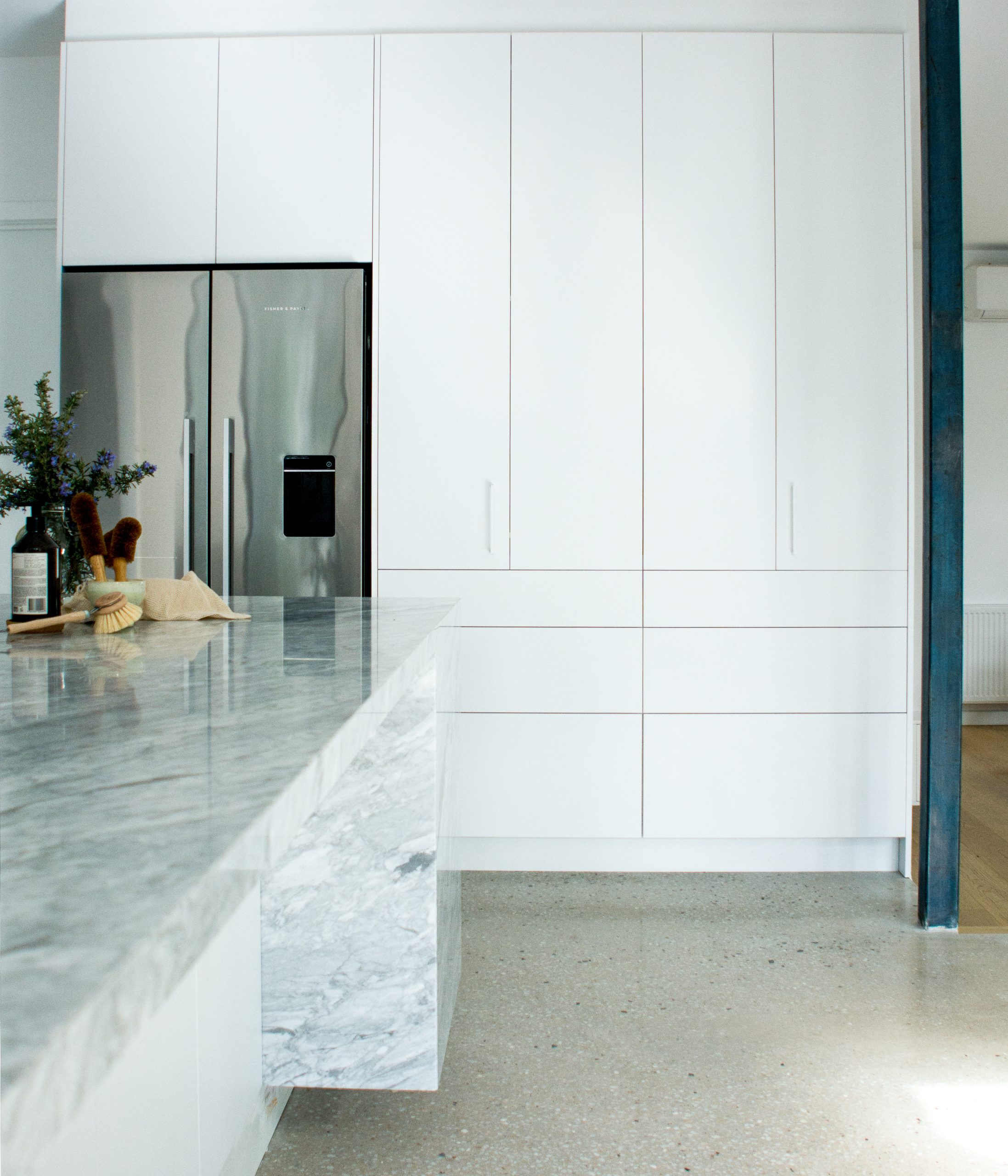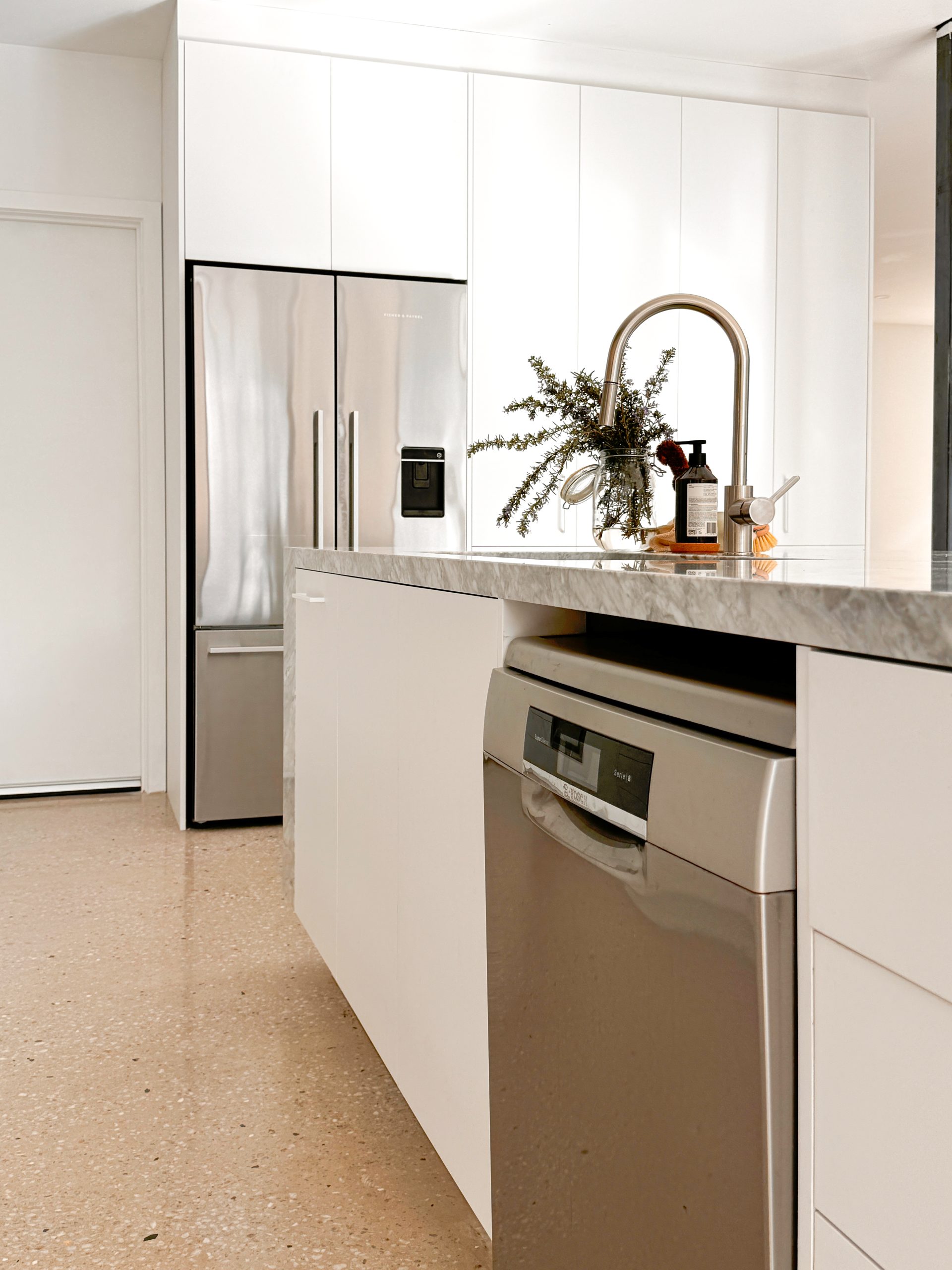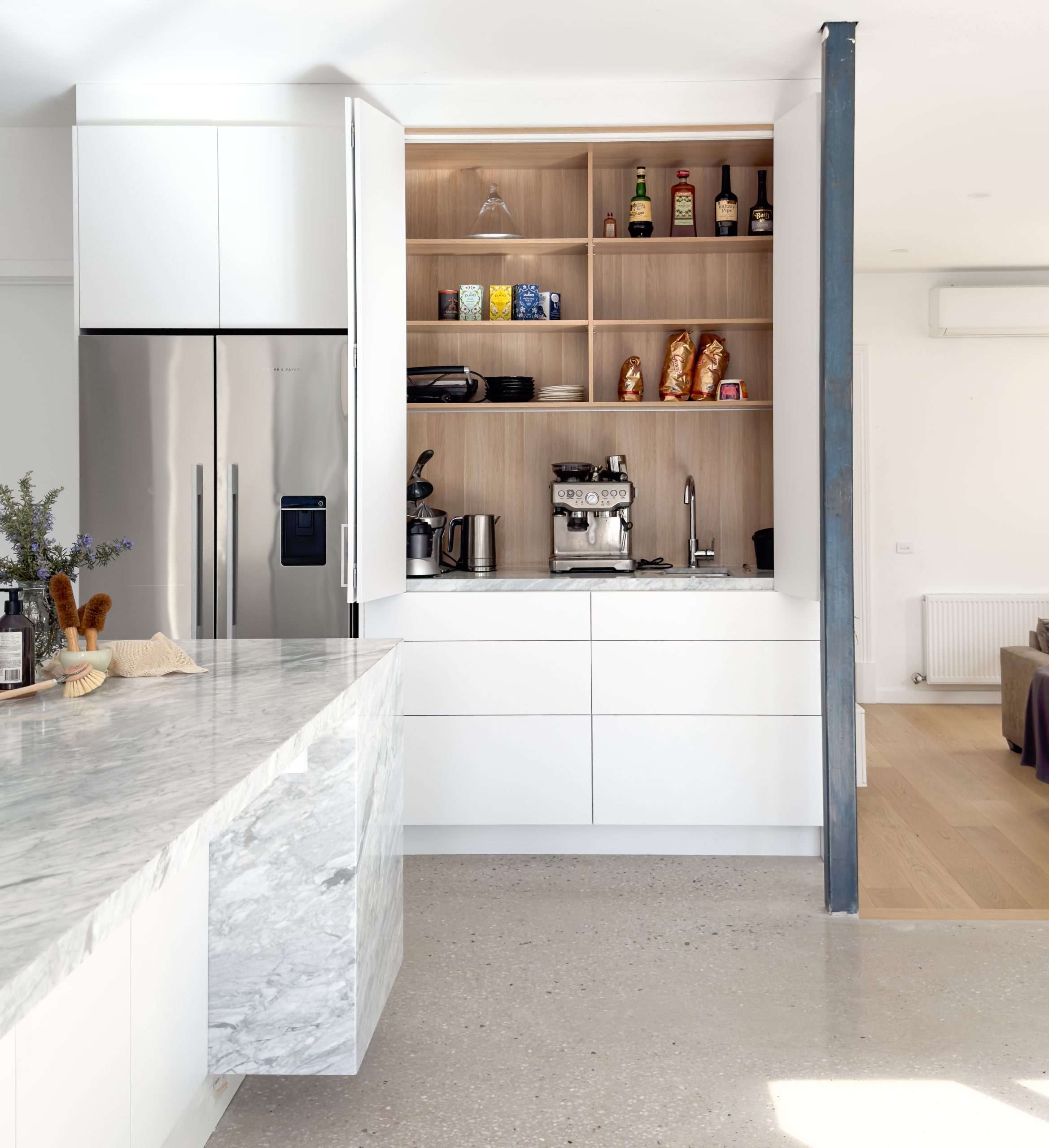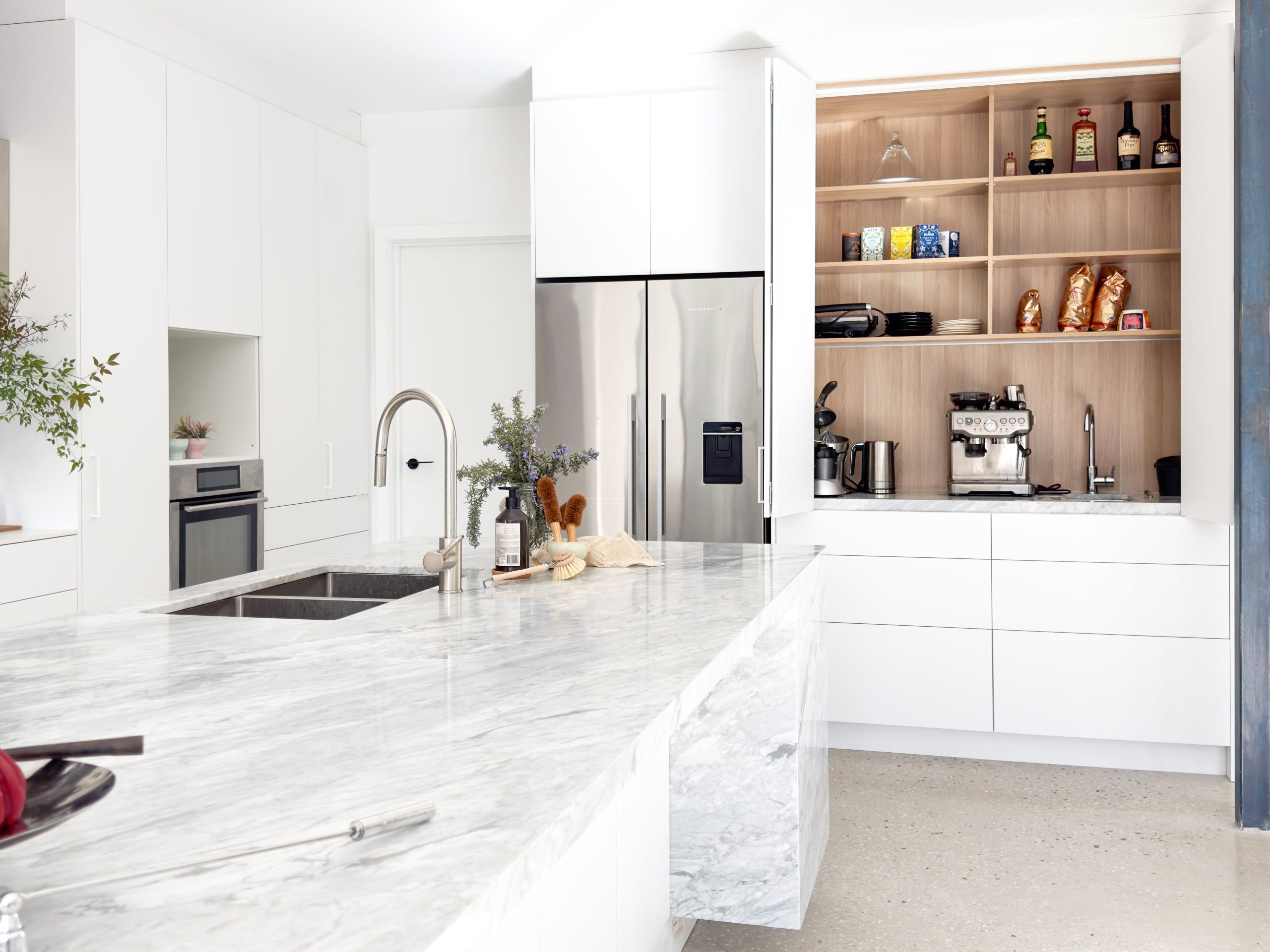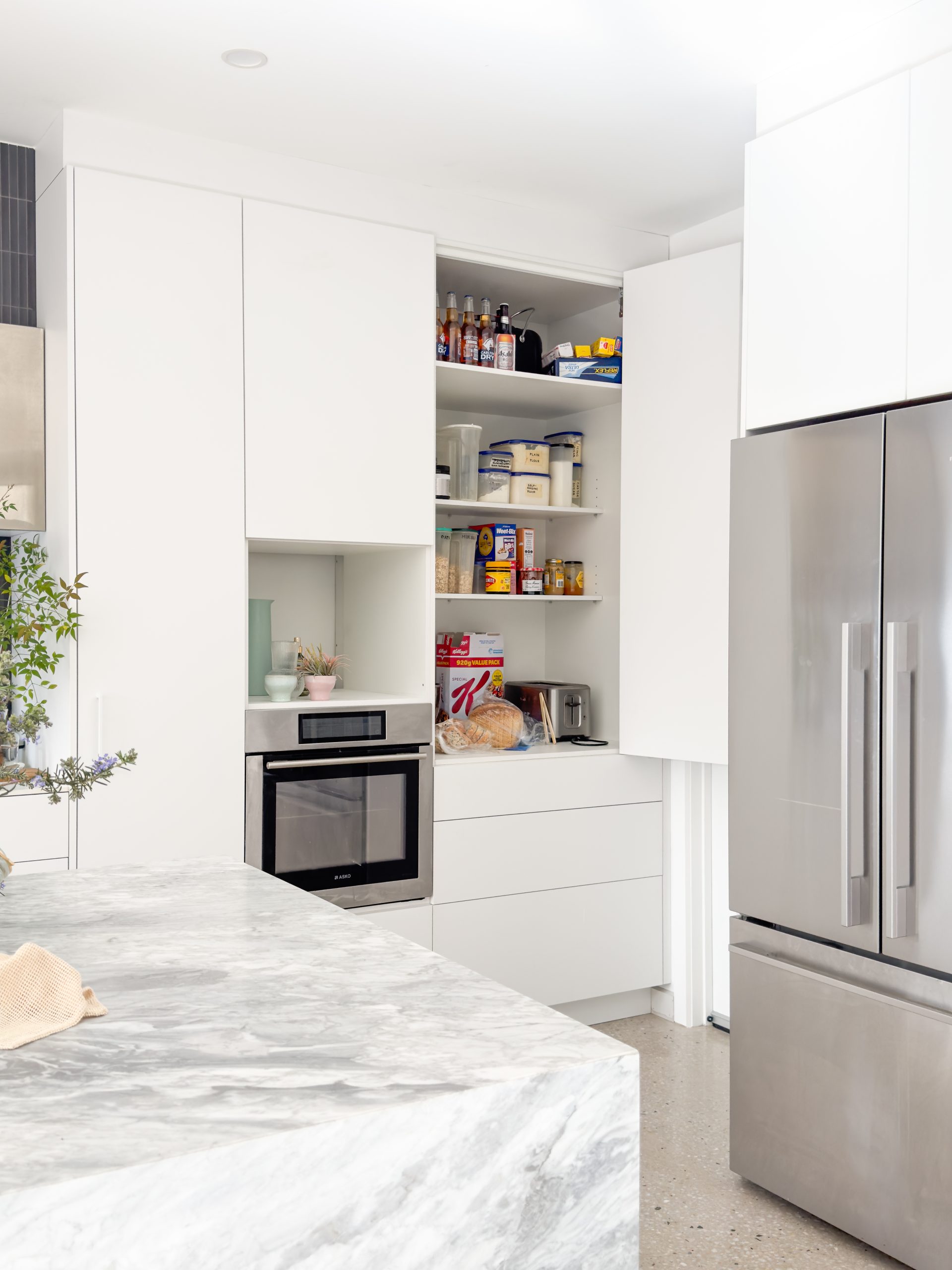 | Hardware: | Hettich Actro 5D softclose undermount runner Blum CLIP top soft-close hinges 2 x 32L under Wesco sink bins on Blum TANDEMBOX Antaro drawers 3 x Blum AVENTOS lift-up doors 1 x SIGE twin pull-out pantry in Chrome finish Hettich WingLine Bi-fold systems LED lighting |