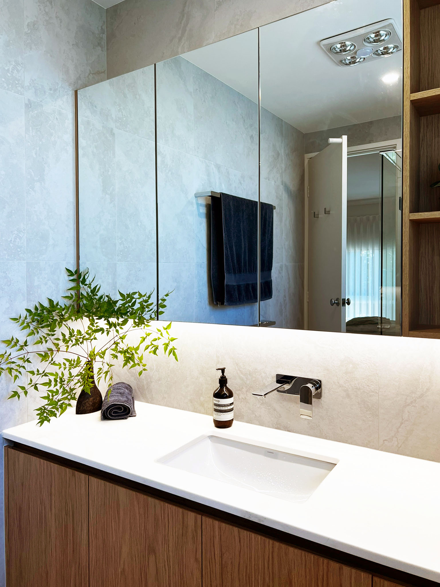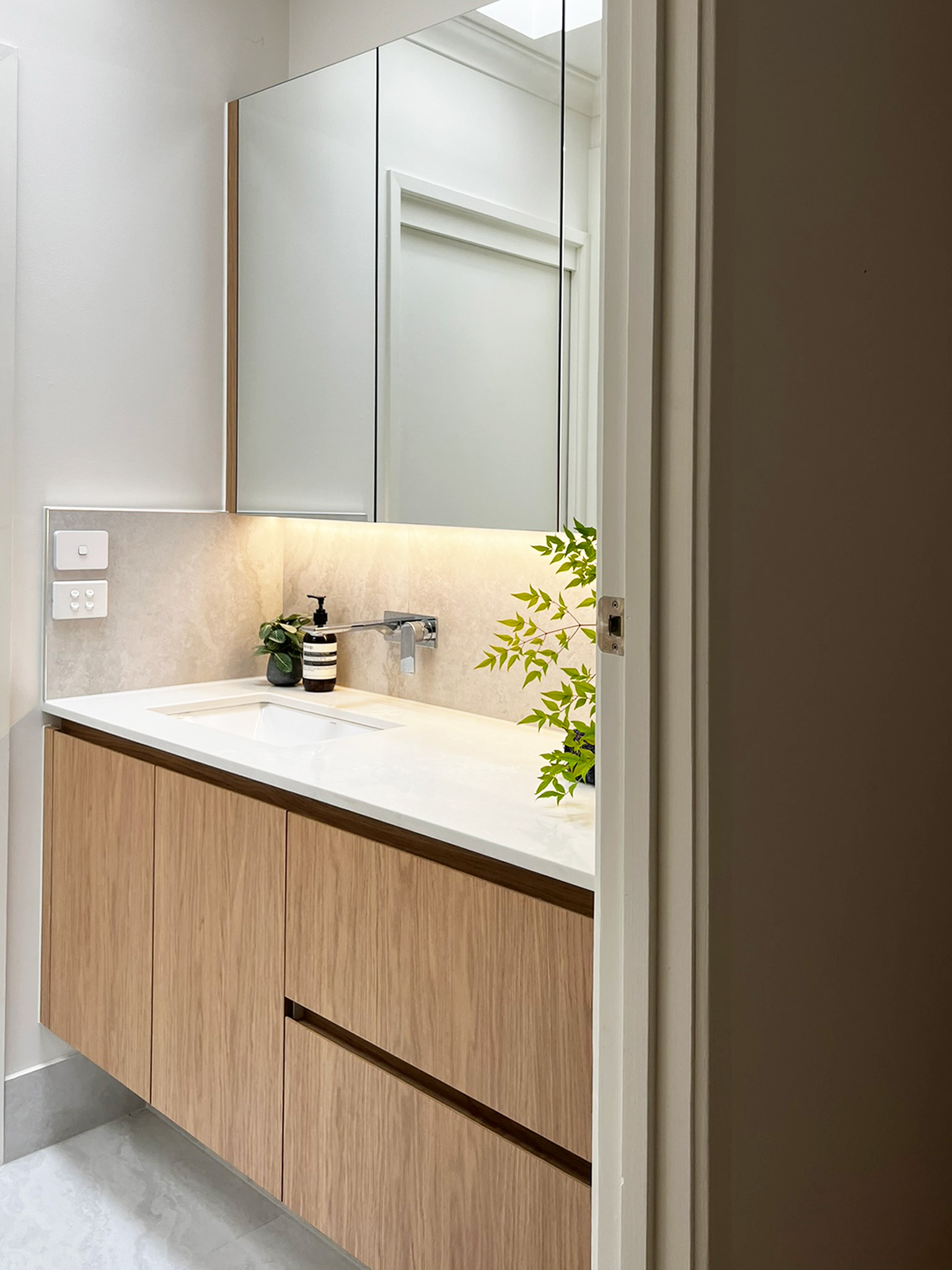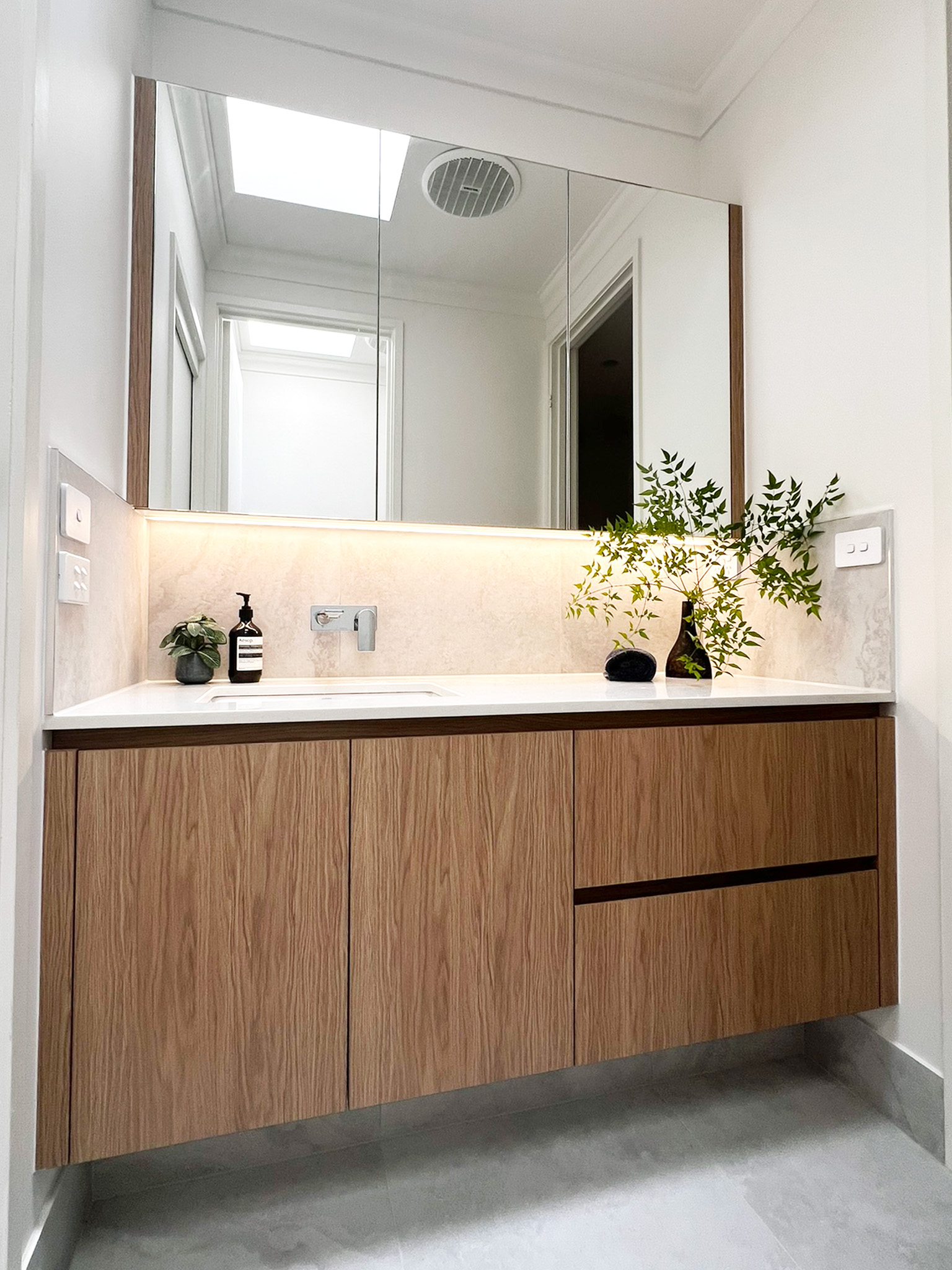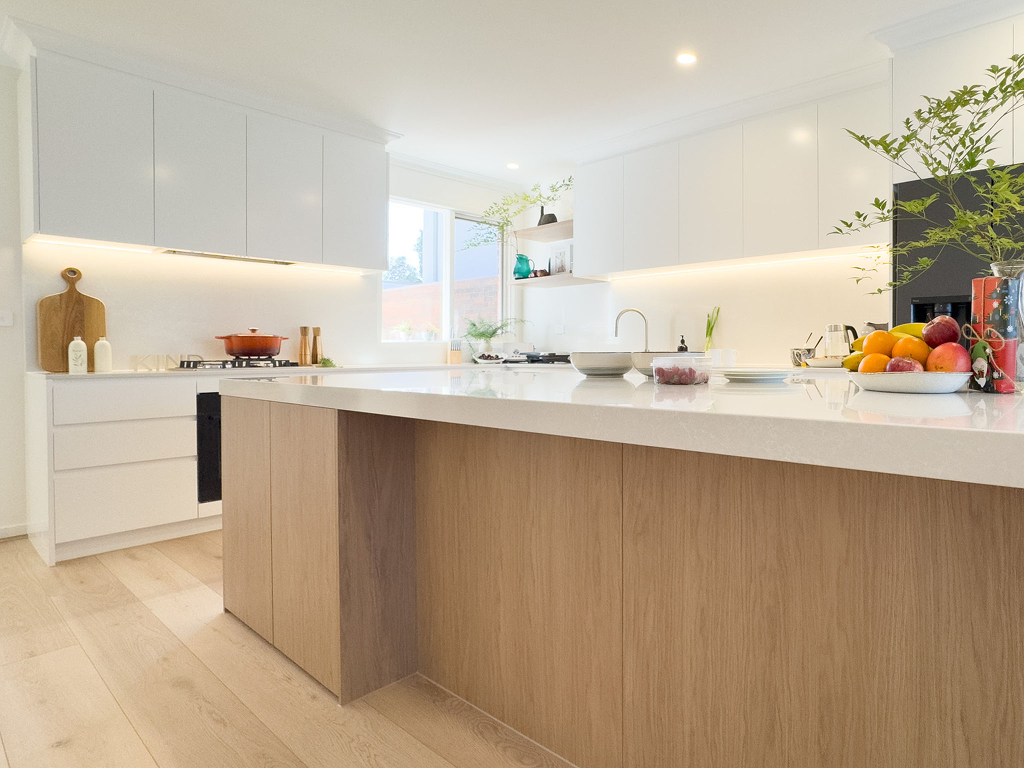 | Description: | White + Warm-toned Woodgrain Kitchen with island & floating shelves. Benchtop & splashback with E. stone, illuminated with LED lighting. Vanities in woodgrain with Sharknose fingerpull handles, mirror cabinets, drawers and inner drawers, and LED lighting. Laundry in Standard White melamine with hangrails & split tall broom cabinets. |