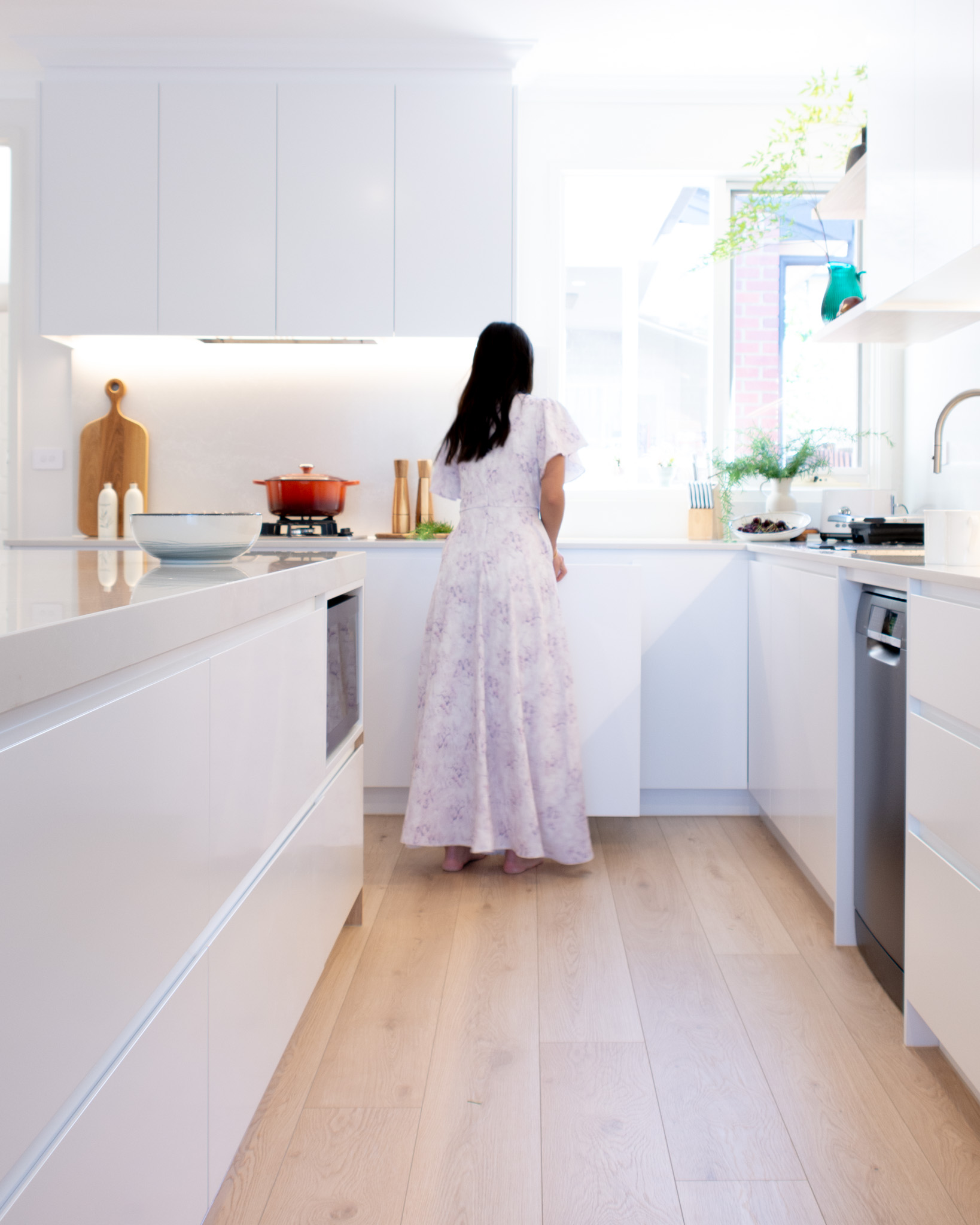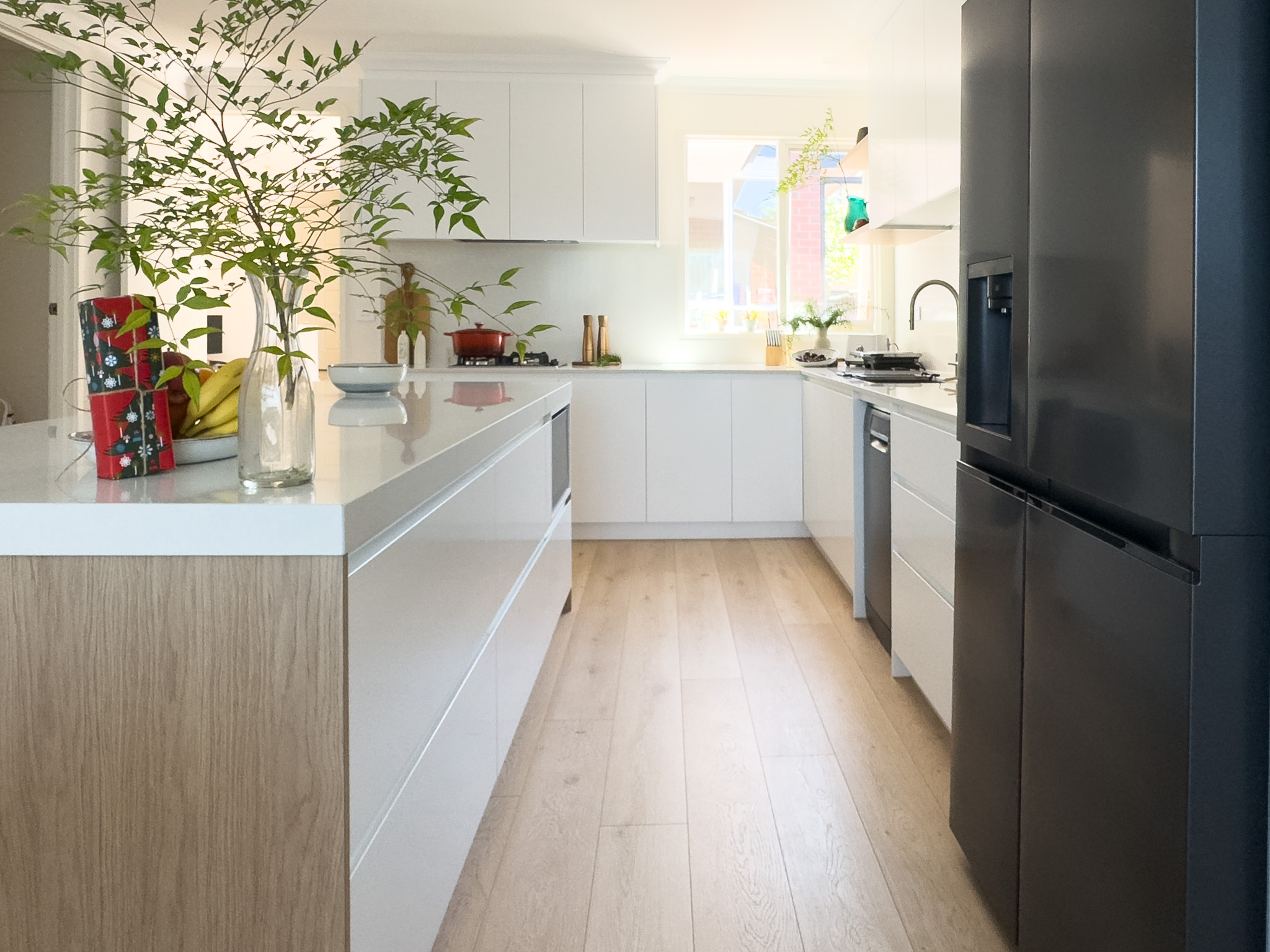 | Doors and panel: | Kitchen - 2PAC Flat Doors in Dulux Lexicon Quarter Semi-Gloss with Sharknose Fingerpull Vanities - Polytec Boston Oak Woodmatt Laundry - Standard White Melamine |