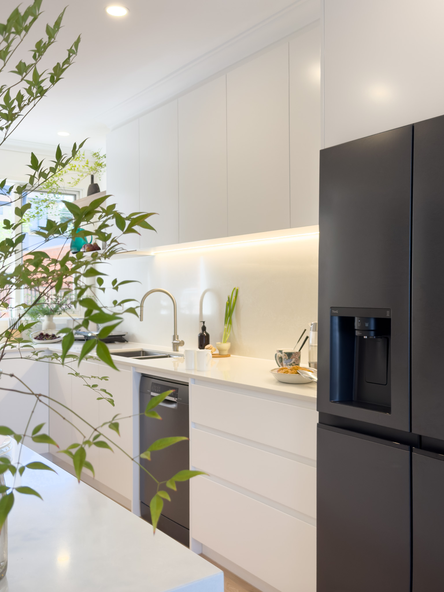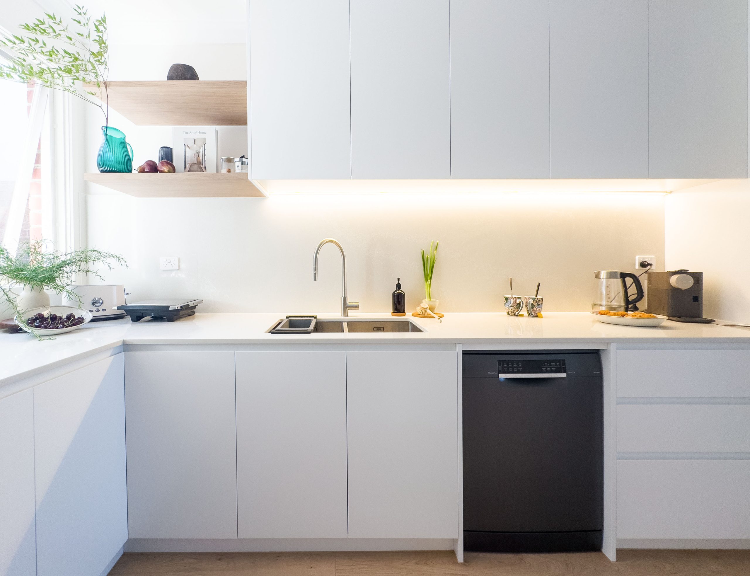 | Hardware: | Hettich Actro 5D softclose undermount runner Blum clip top soft-close hinges 2 x 64L under Wesco sink bins on Blum Tandembox Antaro drawers Sige Pull out spice rack 450 LED lighting |