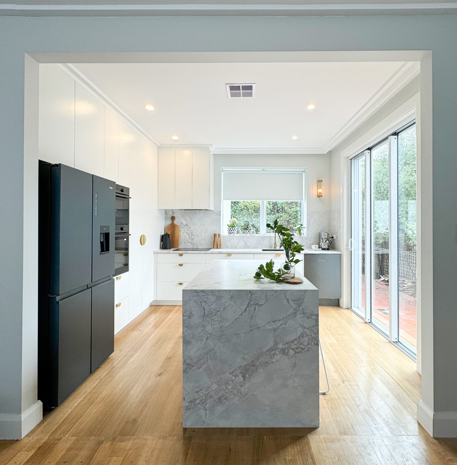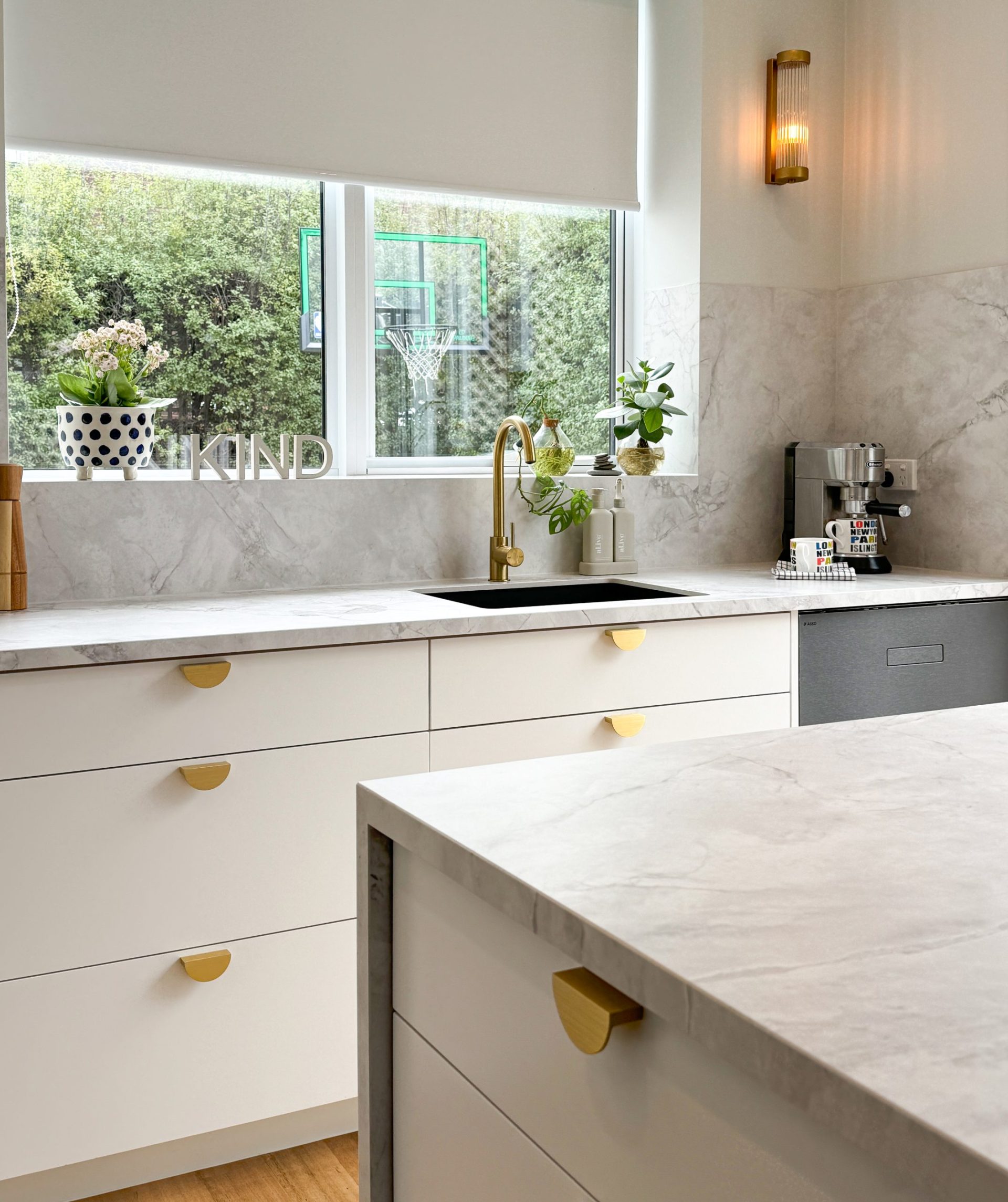 | Description: | A White and gold with grey vein benchtop kitchen renovation revolved around infusing a touch of luxury with simplicity and clean lines. |
