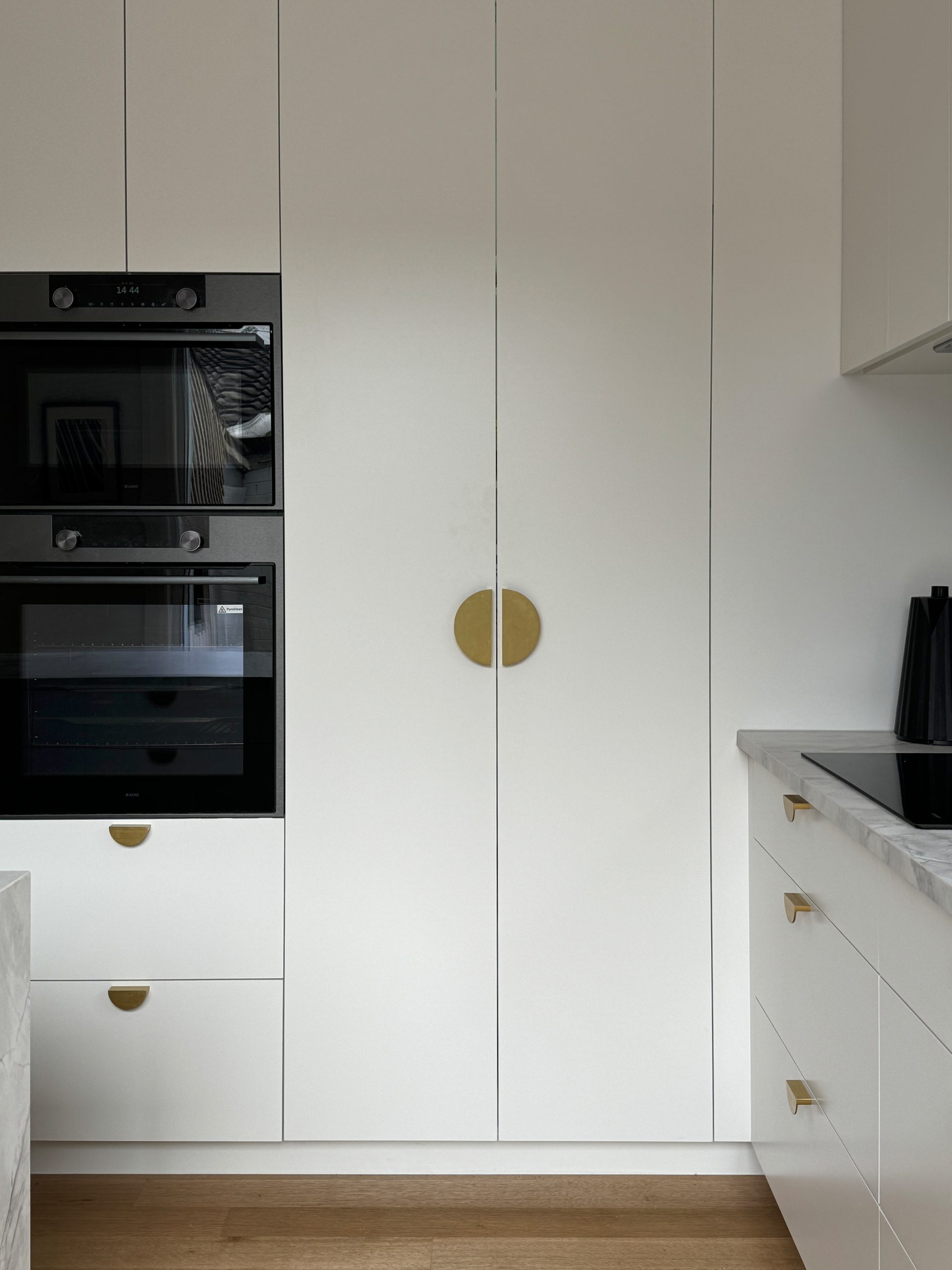 | Hardware: | Hettich Actra soft-close Blum clip top soft-close hinges LO+Co Luna Pull -Brass finish. |