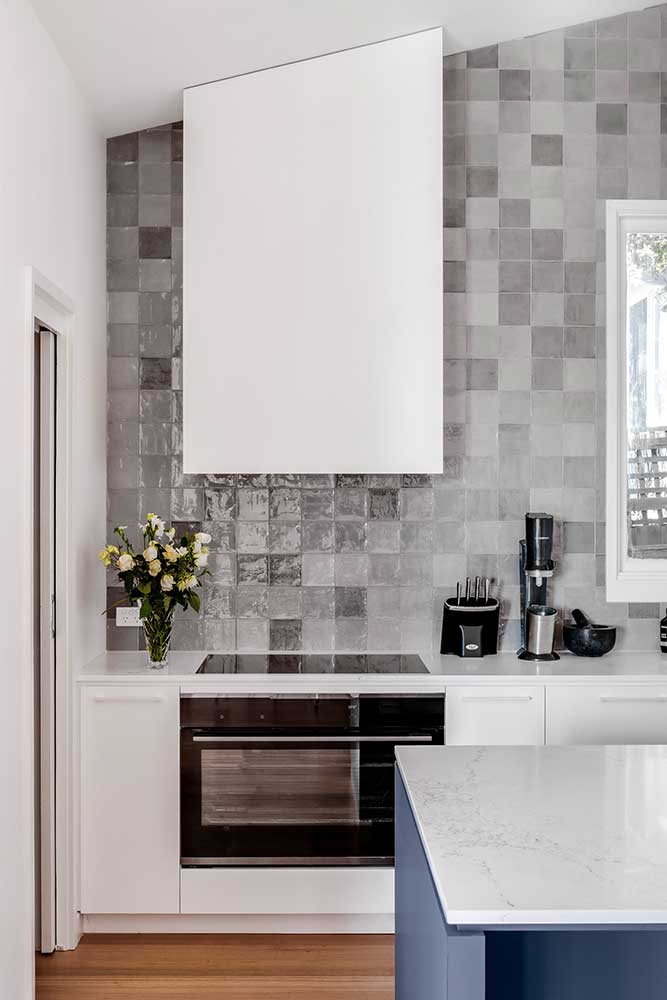 | Description: | Contemporary two-toned Galley kitchen with blue and white, tile splashback, concealed range hood breakfast bar, kicker storage, statement canopy rangehood with chrome accessories. |