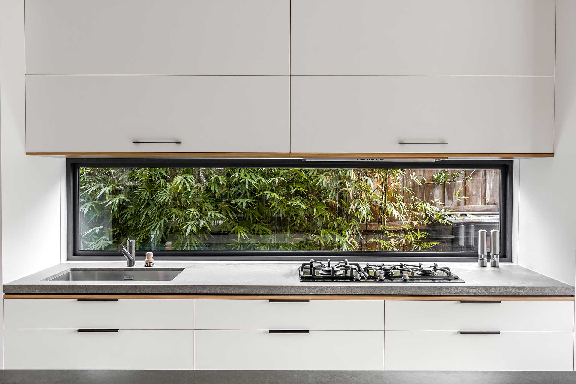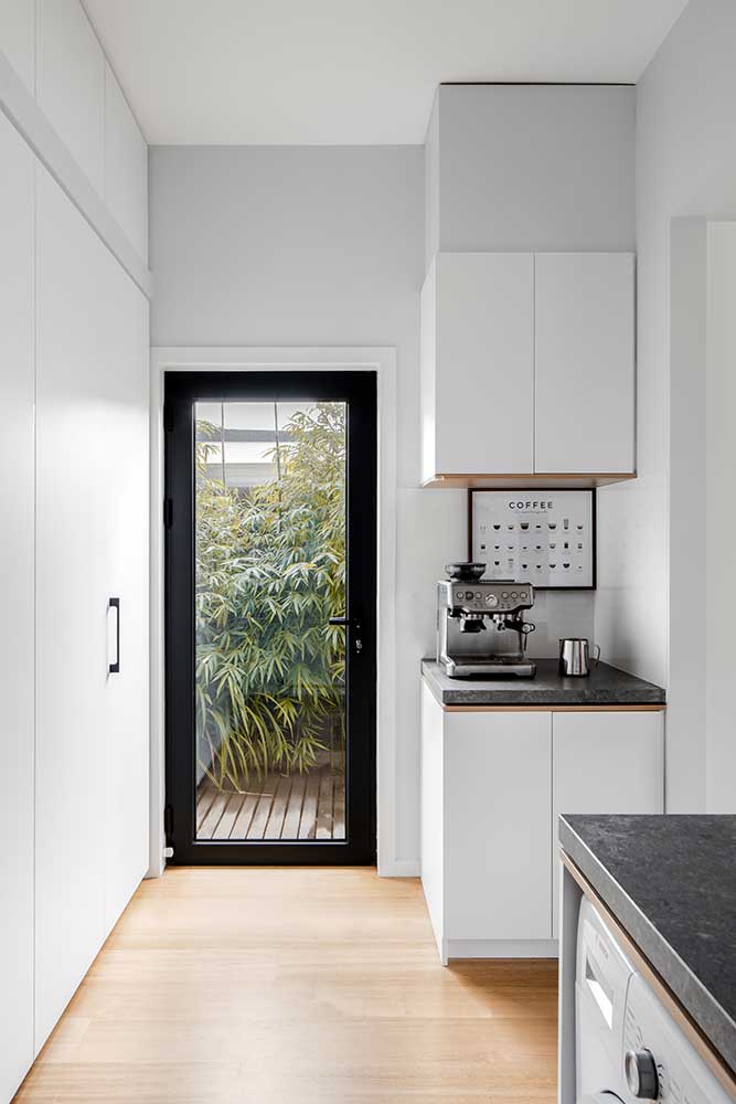 | Description: | All White Industrial style Galley kitchen with concrete, wood grain, window splashback, coffee counter, integrated fridge with chrome, black and copper accessories, |