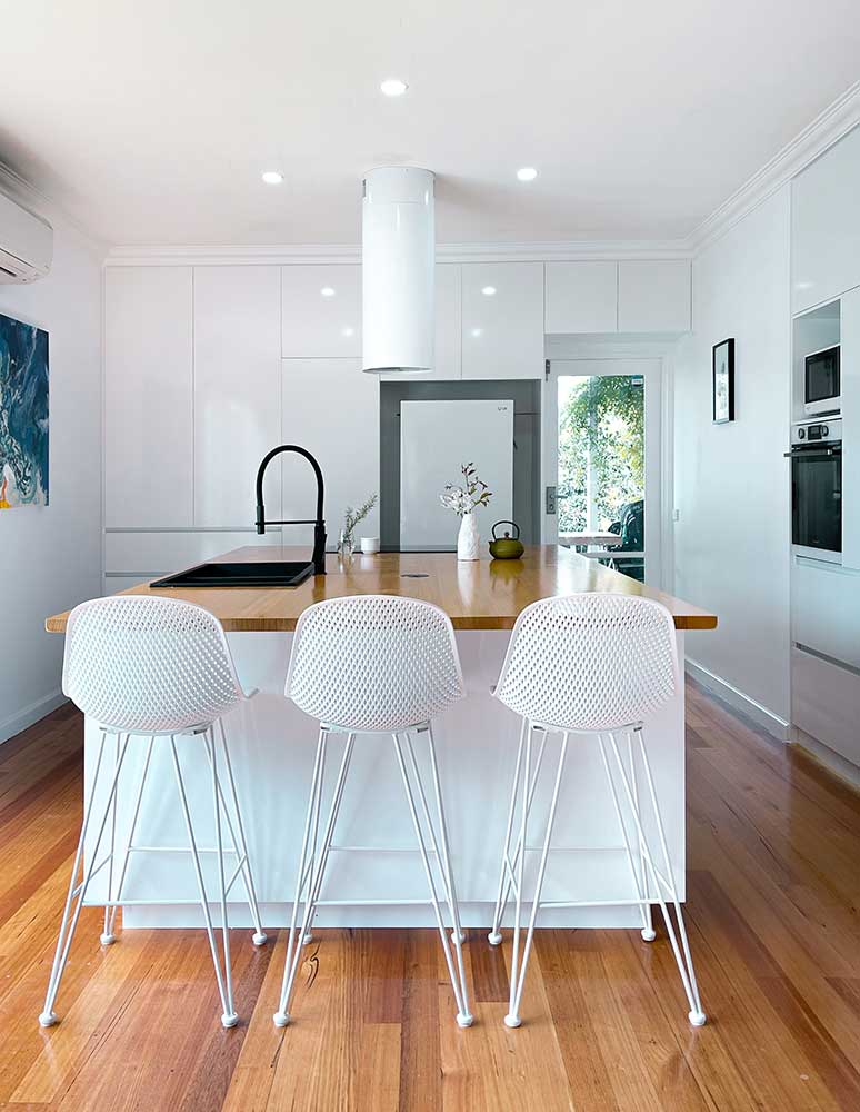| Description: | The all-White Minimalist Galley kitchen has a solid timber benchtop with a power outlet, a cylindrical canopy rangehood, a finger-pull, and a breakfast bar with black accessories. |