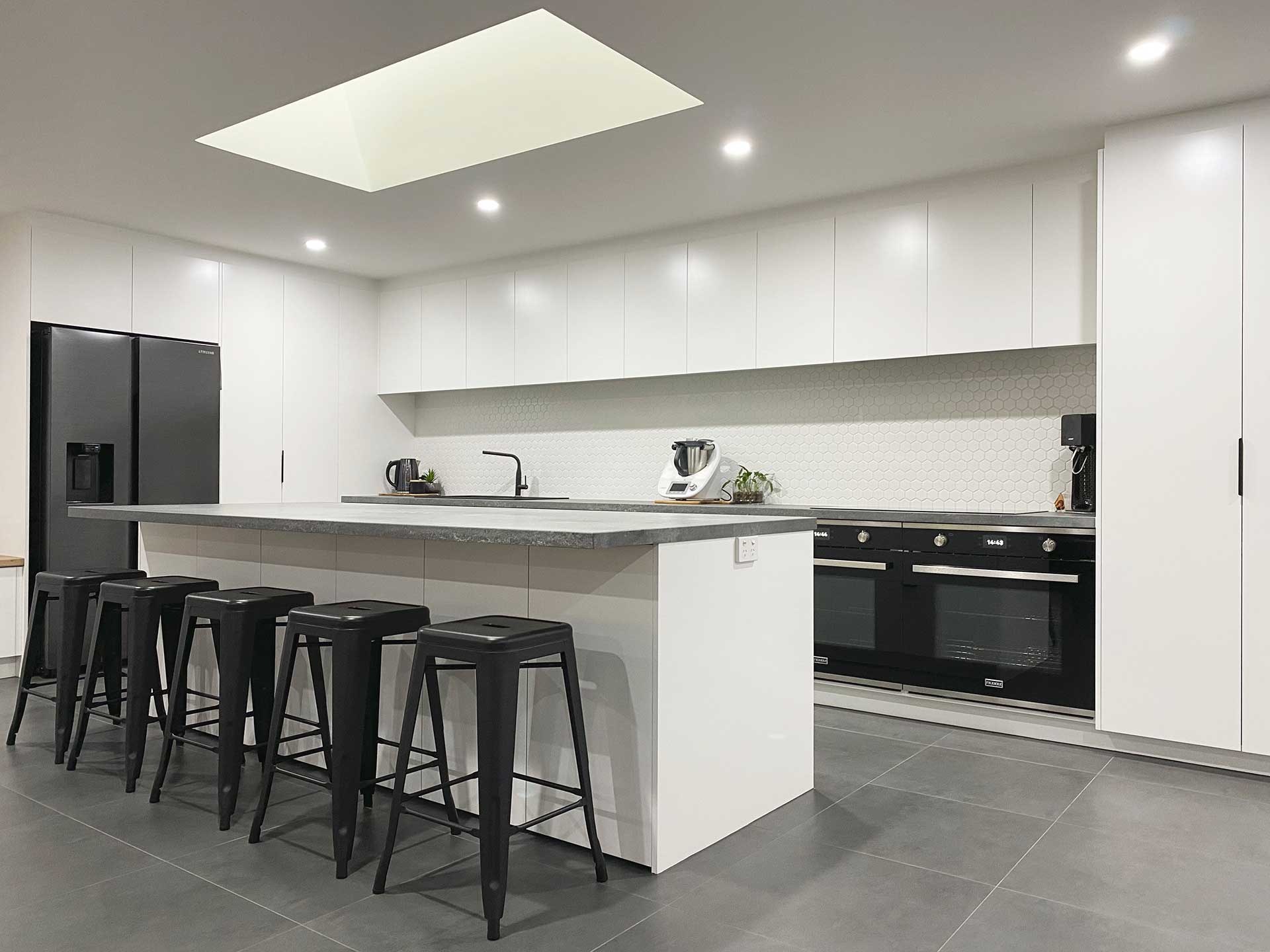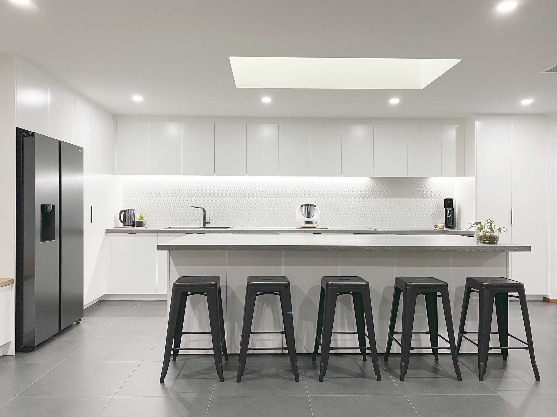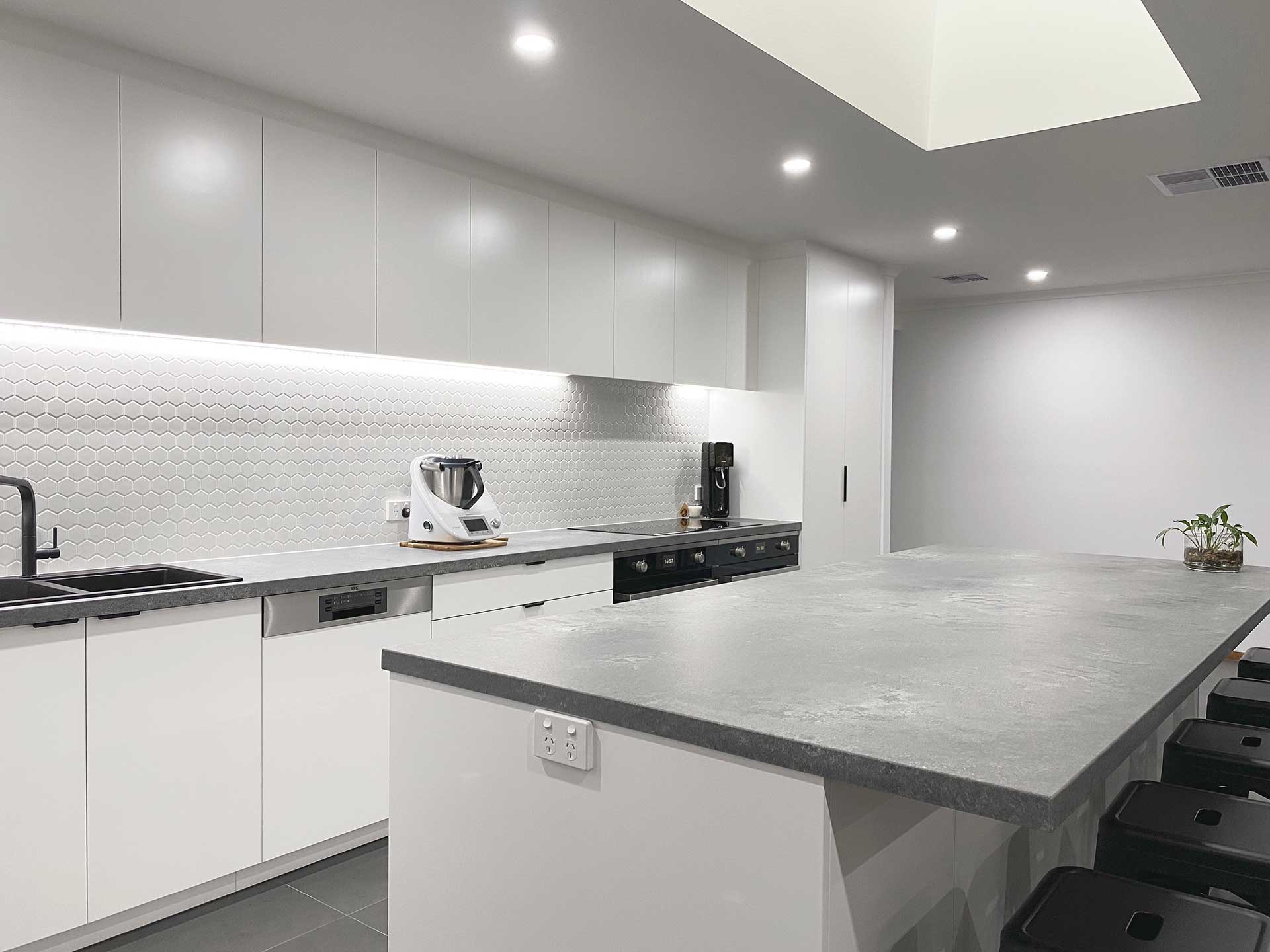 | Description: | White and Grey toned Minimalist L-shape with kitchen island with concrete finish benchtop, hexagonal splashback, semi-integrated dishwasher, breakfast bar, with matt black accessories |