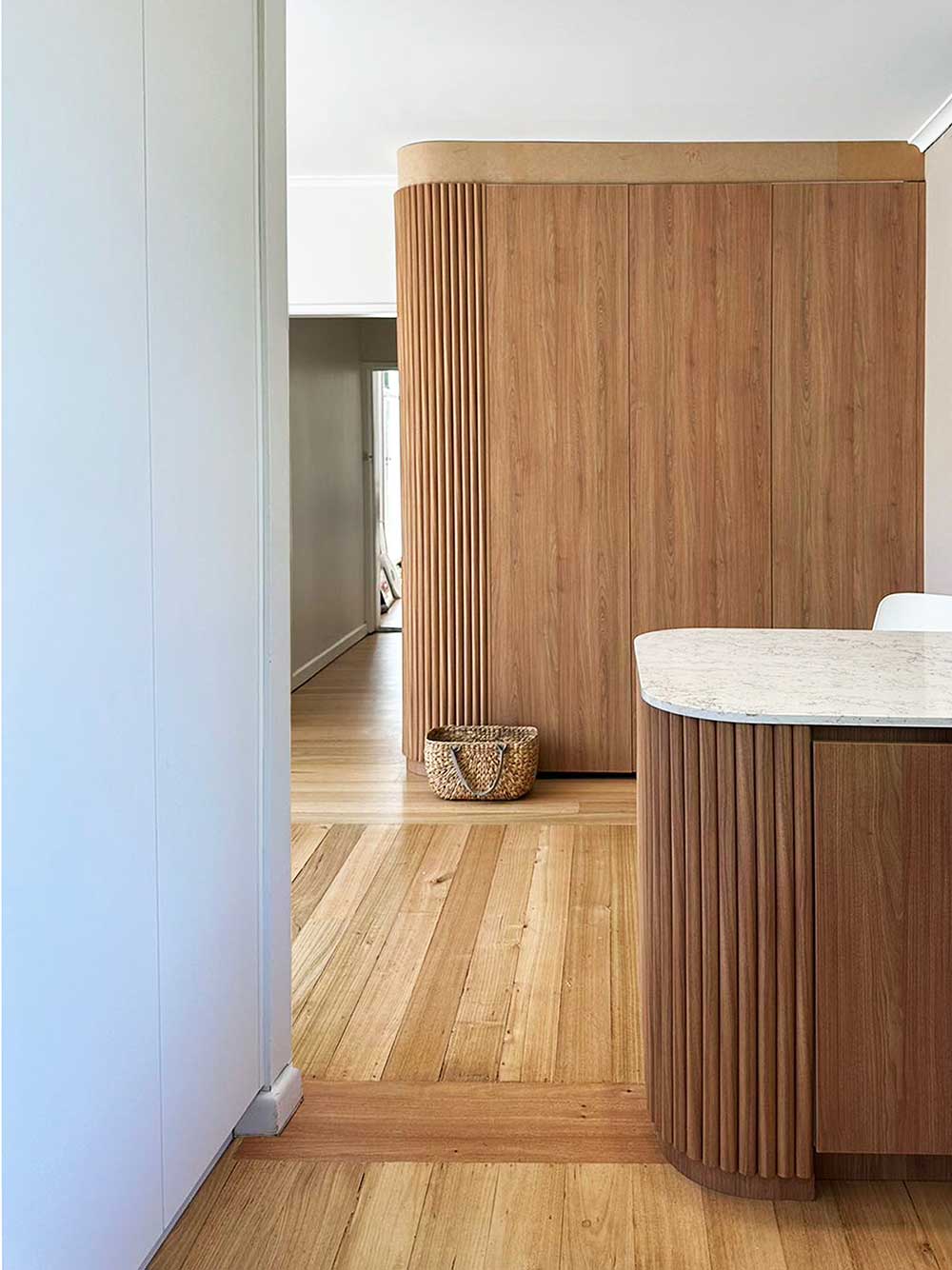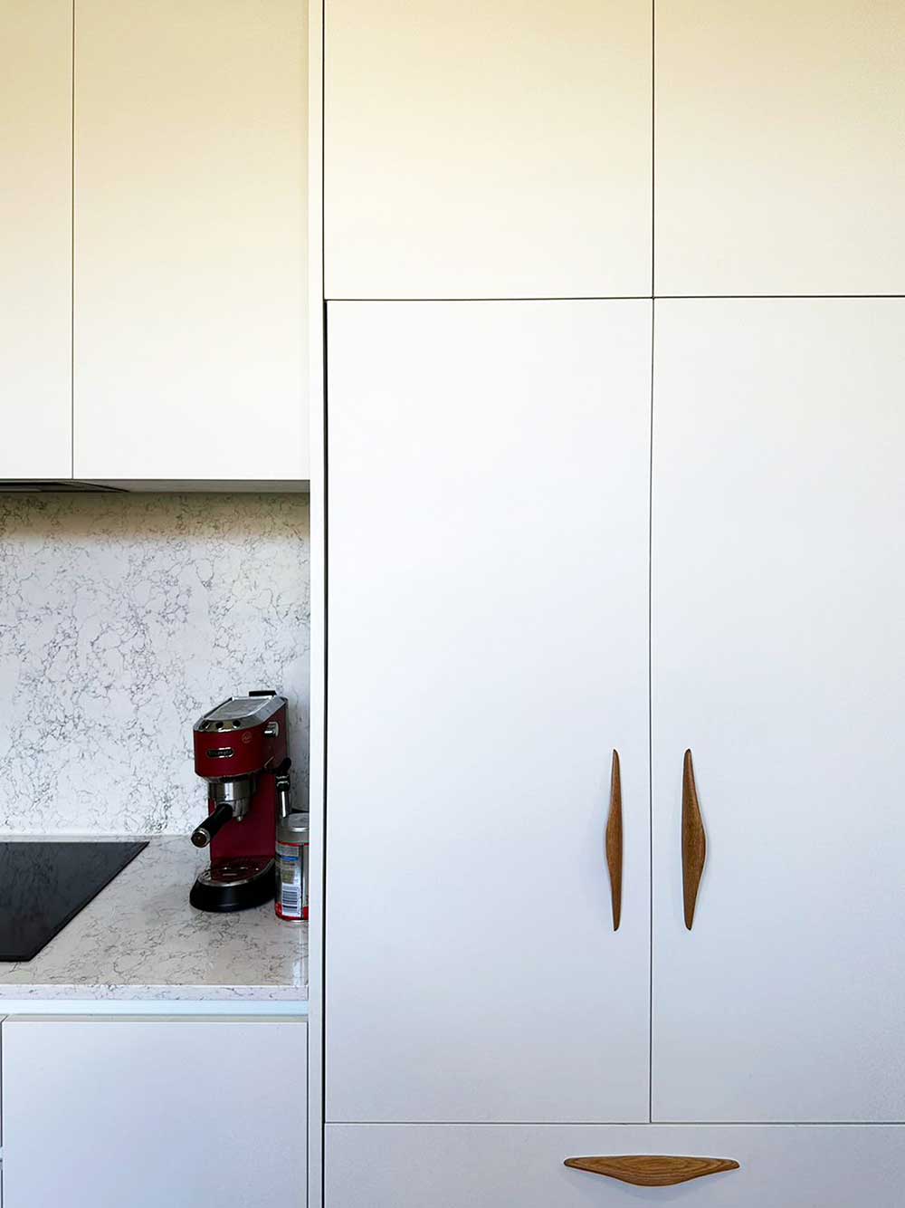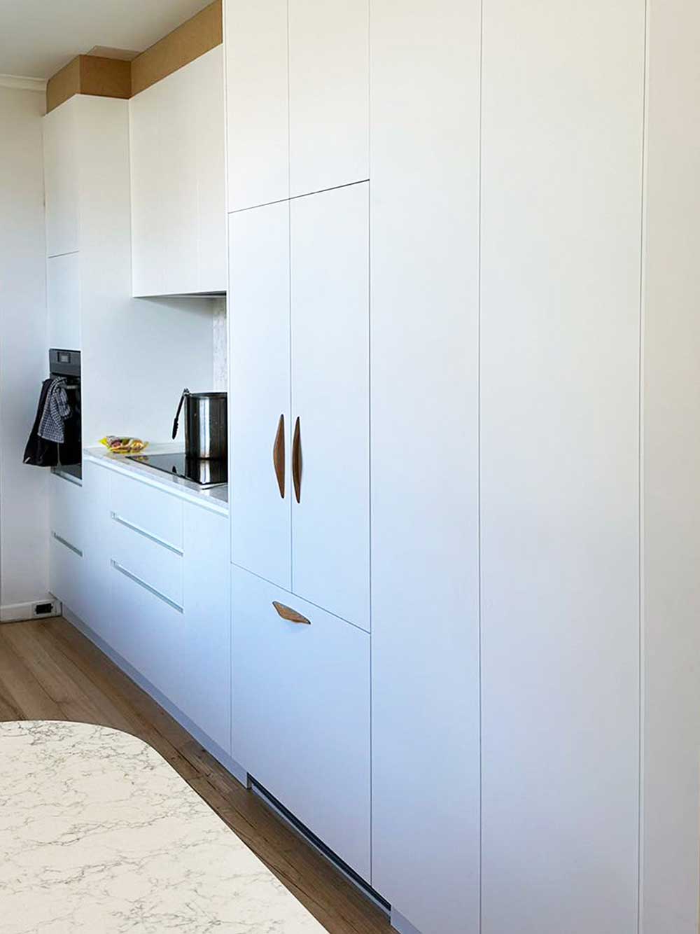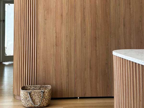 | Doors and panel: | Polytec solid colour natural finish Polytec woodgrain finish for shelf Polytec staccawood 17mm x 34mm half round woodgrain range |