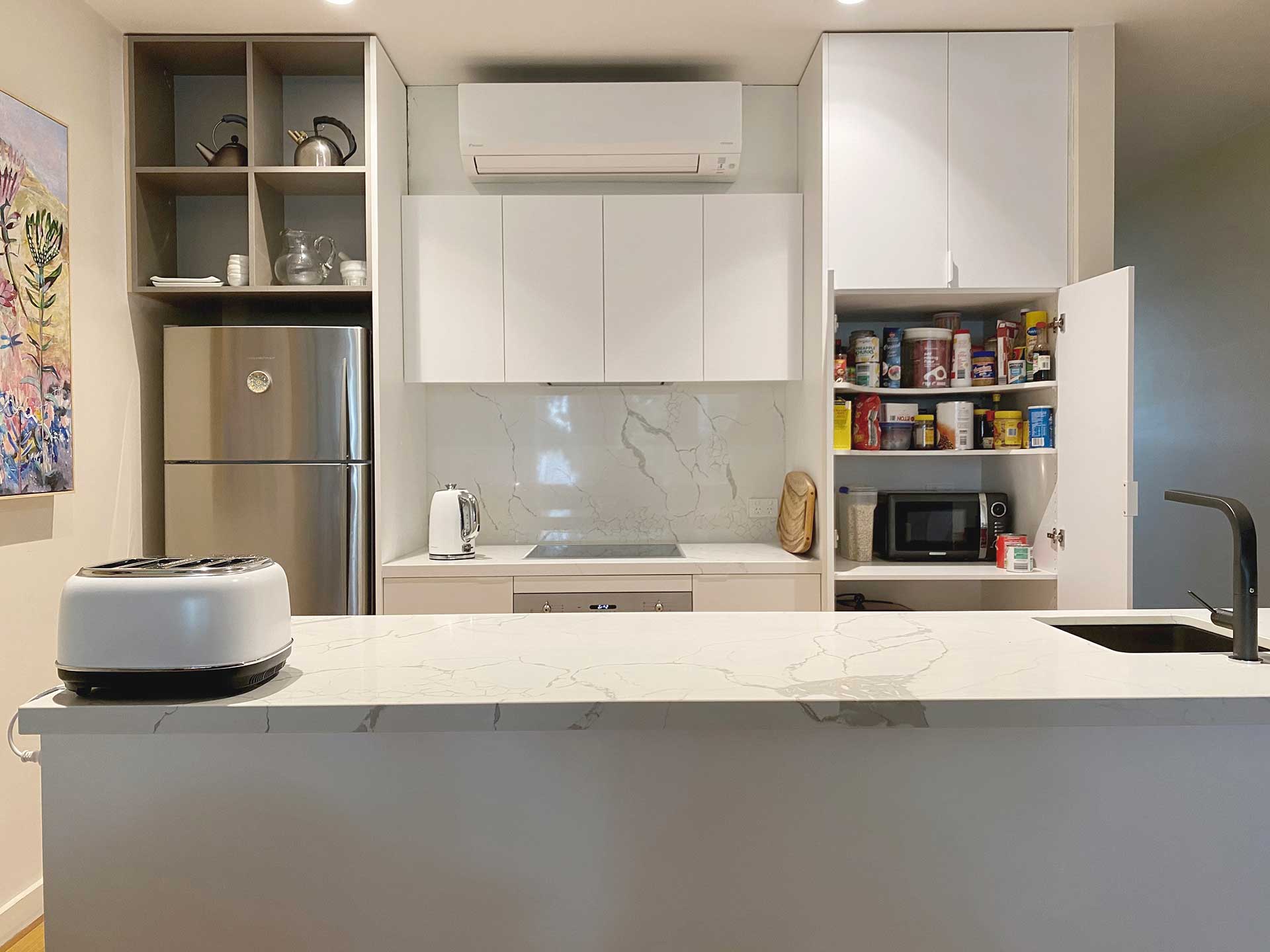 | Description: | All-White marble-vein Minimalist Galley kitchen, appliance garage, concealed rangehood, breakfast bar, open shelves, with black and white accessories. |