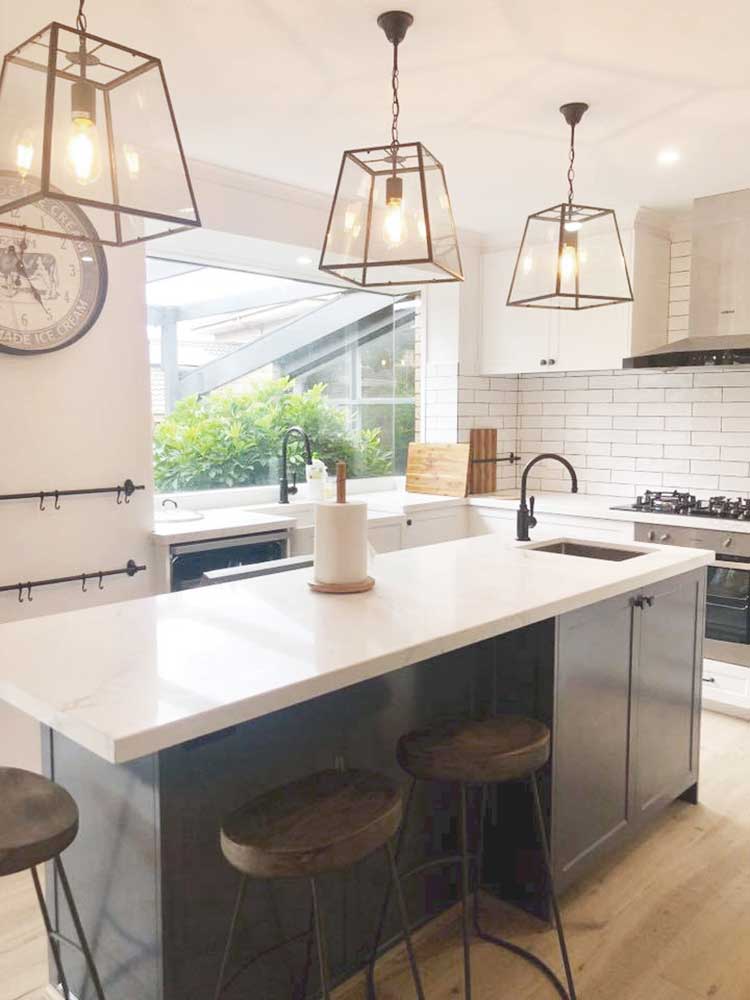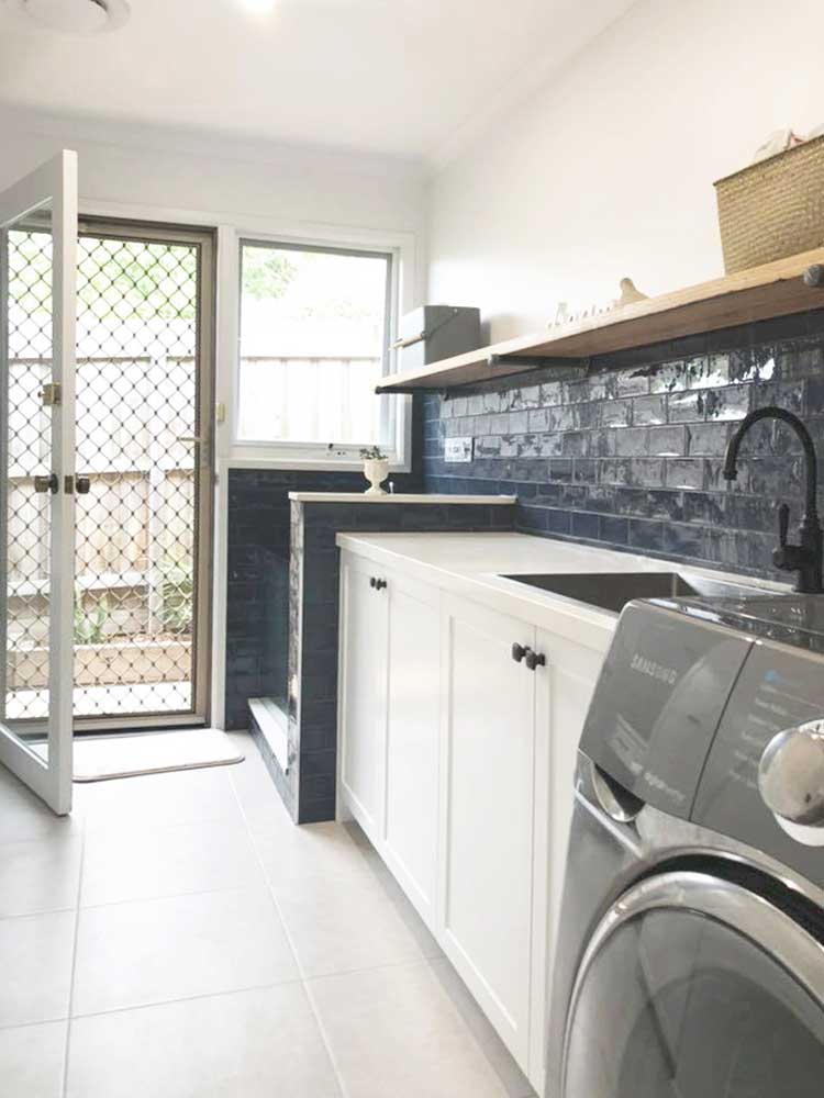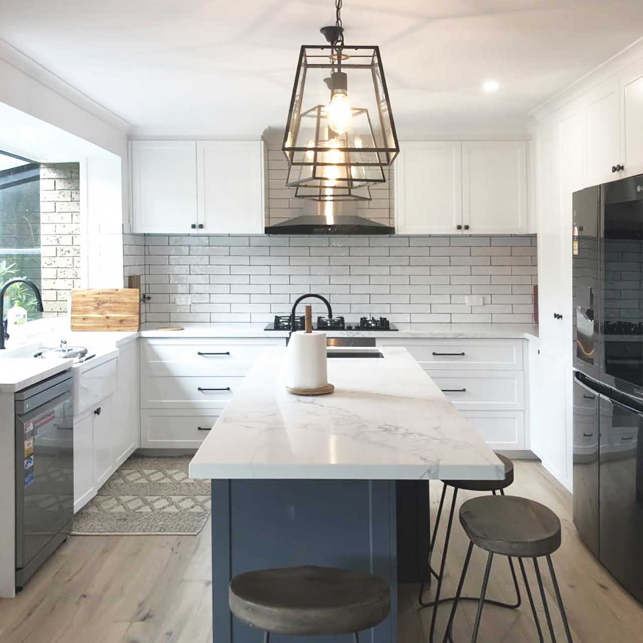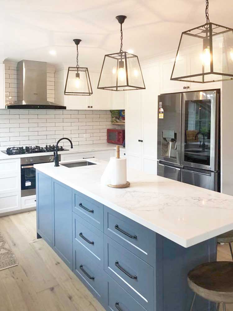| Description: | Two-toned White and Blue Hampton U-shape kitchen, canopy rangehood, tile splashback, breakfast bar, with black and gunmetal accessories. |