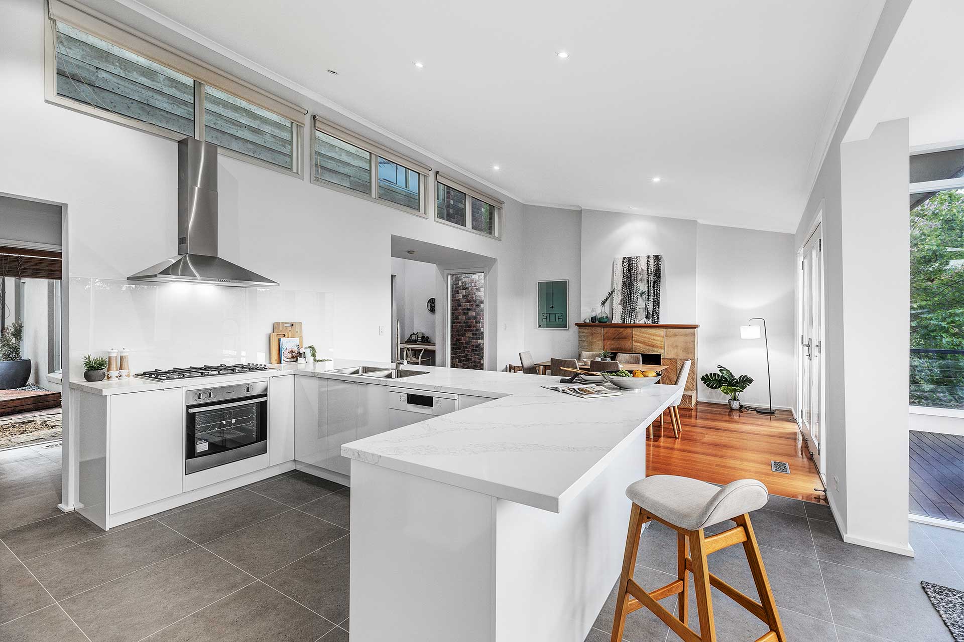 | Description: | All-White Contemporary U shape kitchen, breakfast bar, canopy rangehood, glass splashback with stainless steel accessories. |